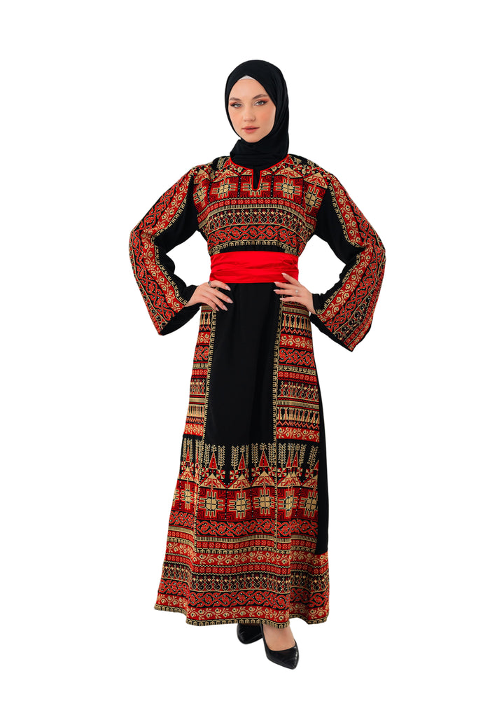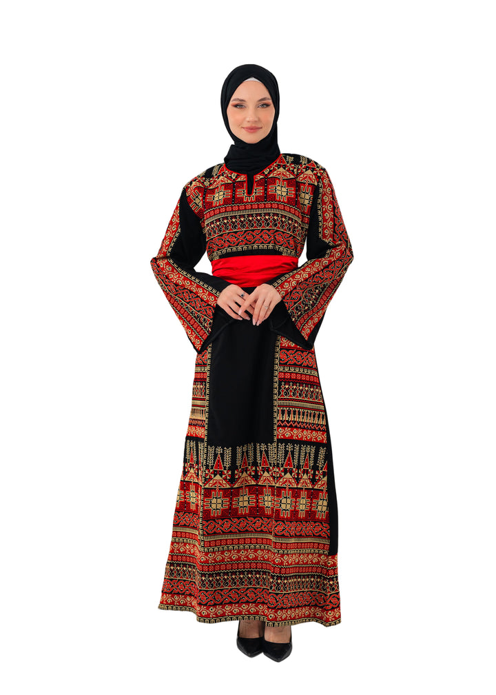 Black Color Red And Gold Palestine Embroidered Red Belted Dress C100054