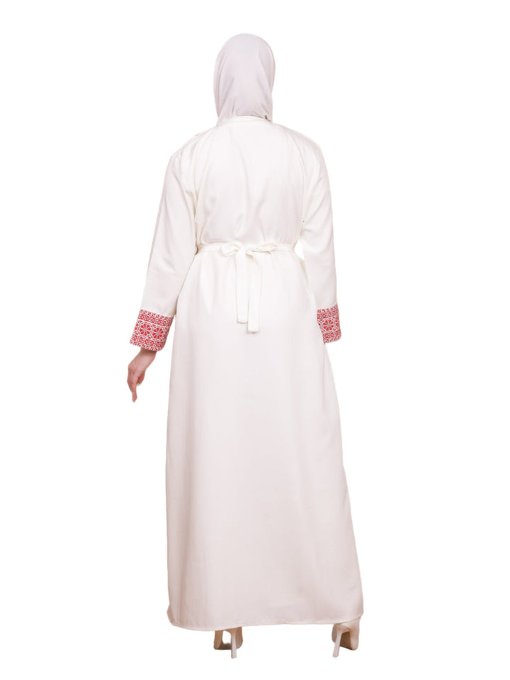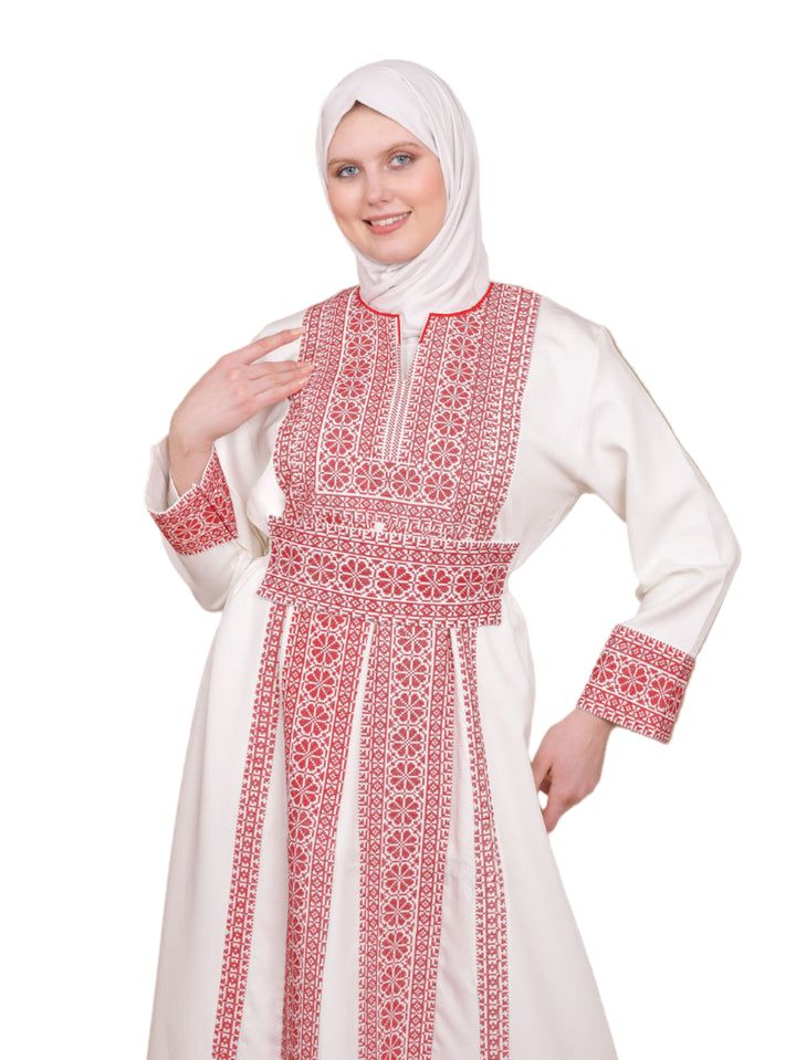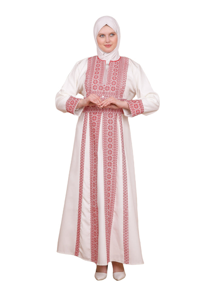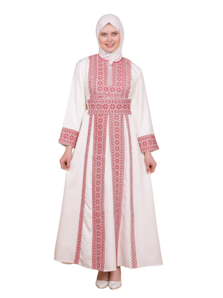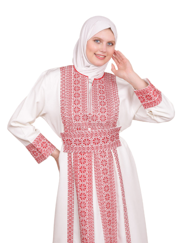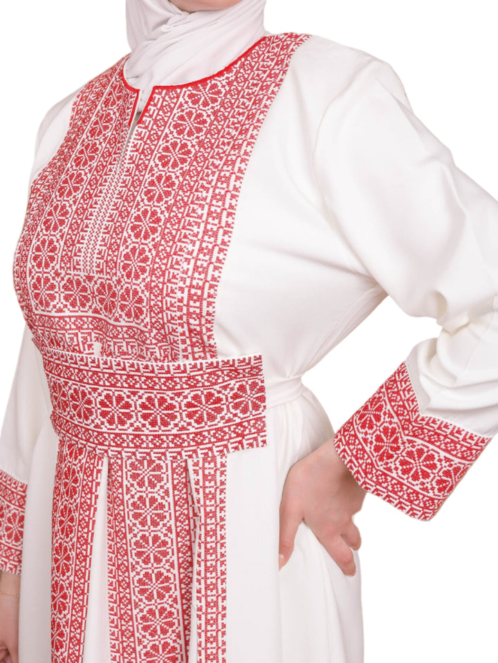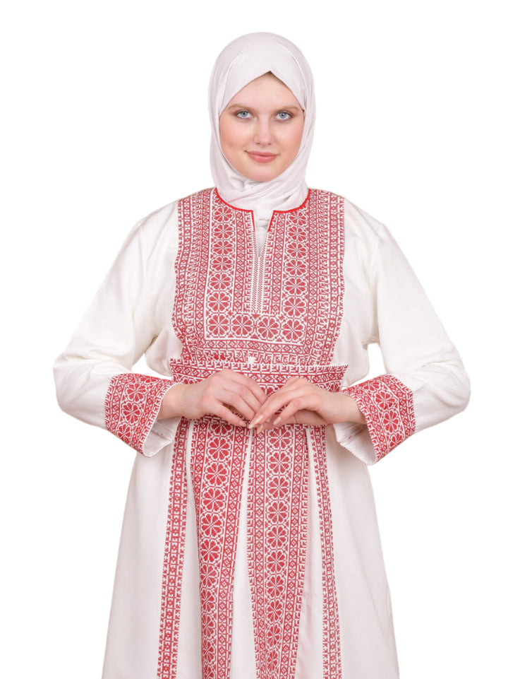 White Color Red Roses Palestinian Traditional Embroidered Dress C100056
