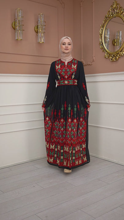 ثوب كنفا اسود تطريز فلسطيني وجهين بياقة دائرية وقماشة منخلية