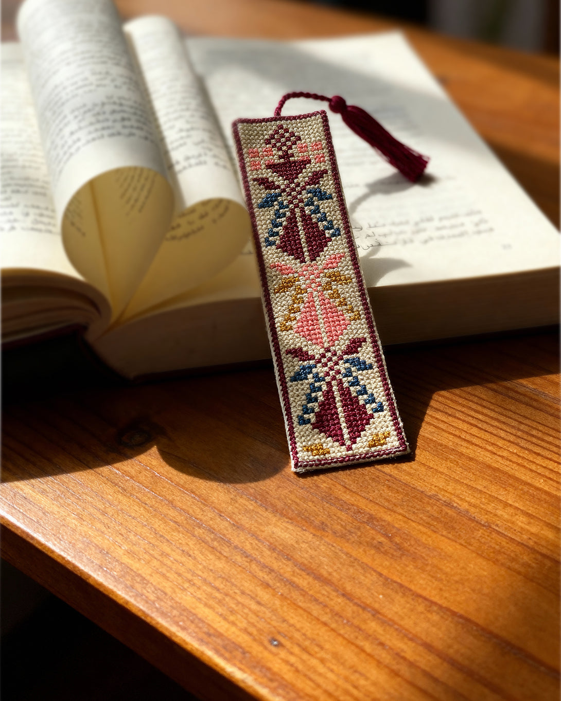 An **elegant and artisanal bookmark** designed to add a touch of heritage to your reading experience. This piece is a small work of art, embodying the beauty of Palestinian embroidery (**Tatreez**) in a practical and portable accessory.