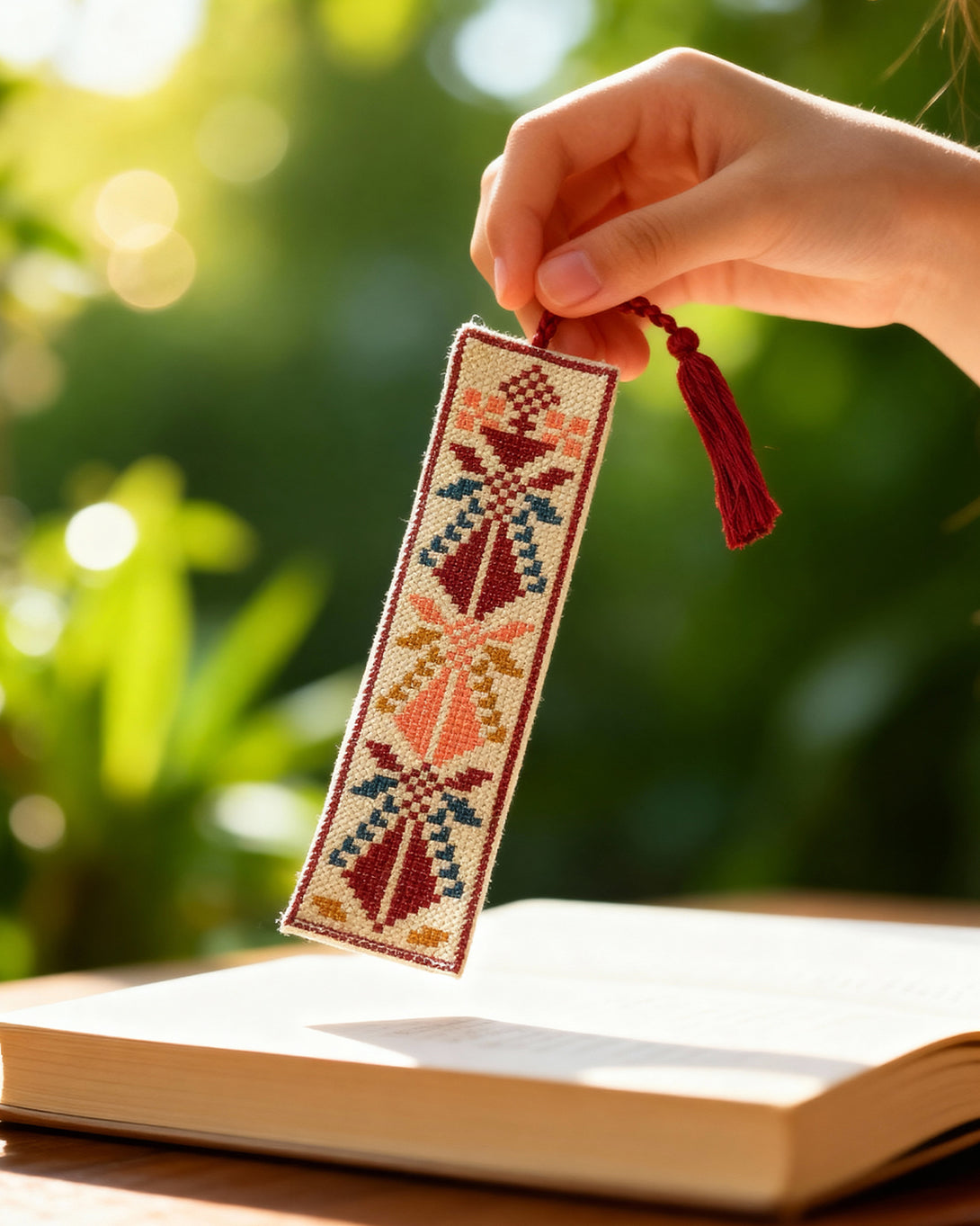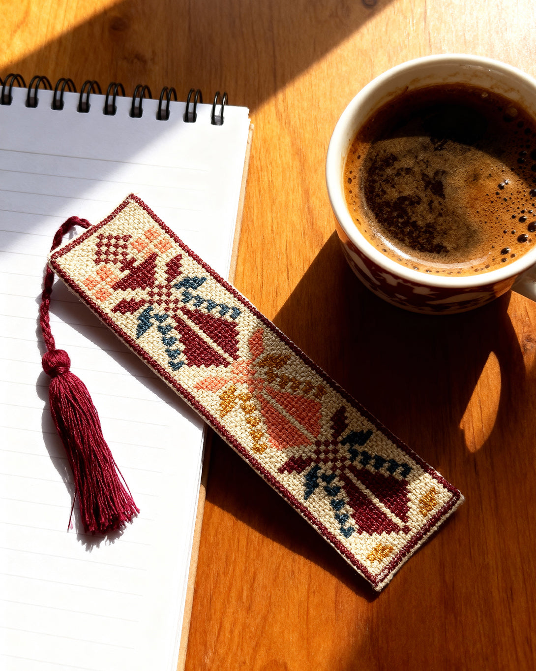 The bookmark is crafted from durable fabric with a light background, featuring precise embroidery that carries **traditional geometric and floral motifs**. The dimensions are ideal (**16x5 cm**), making it suitable for books of all sizes.
