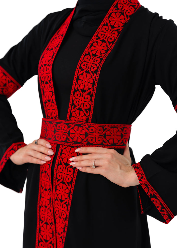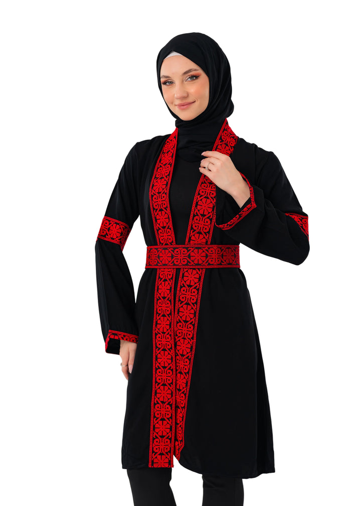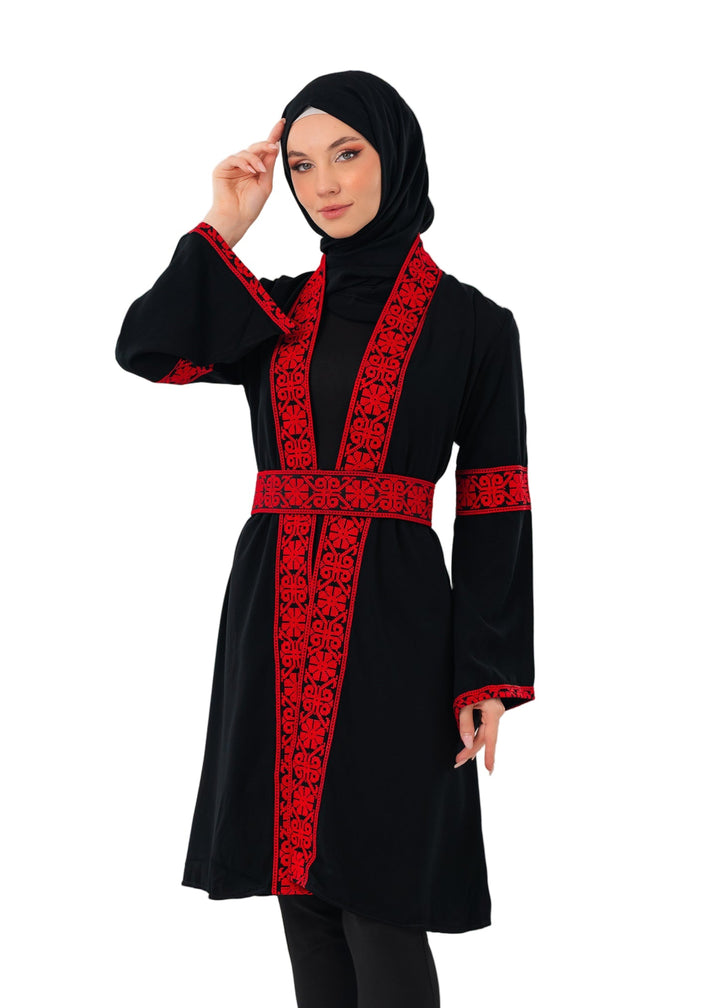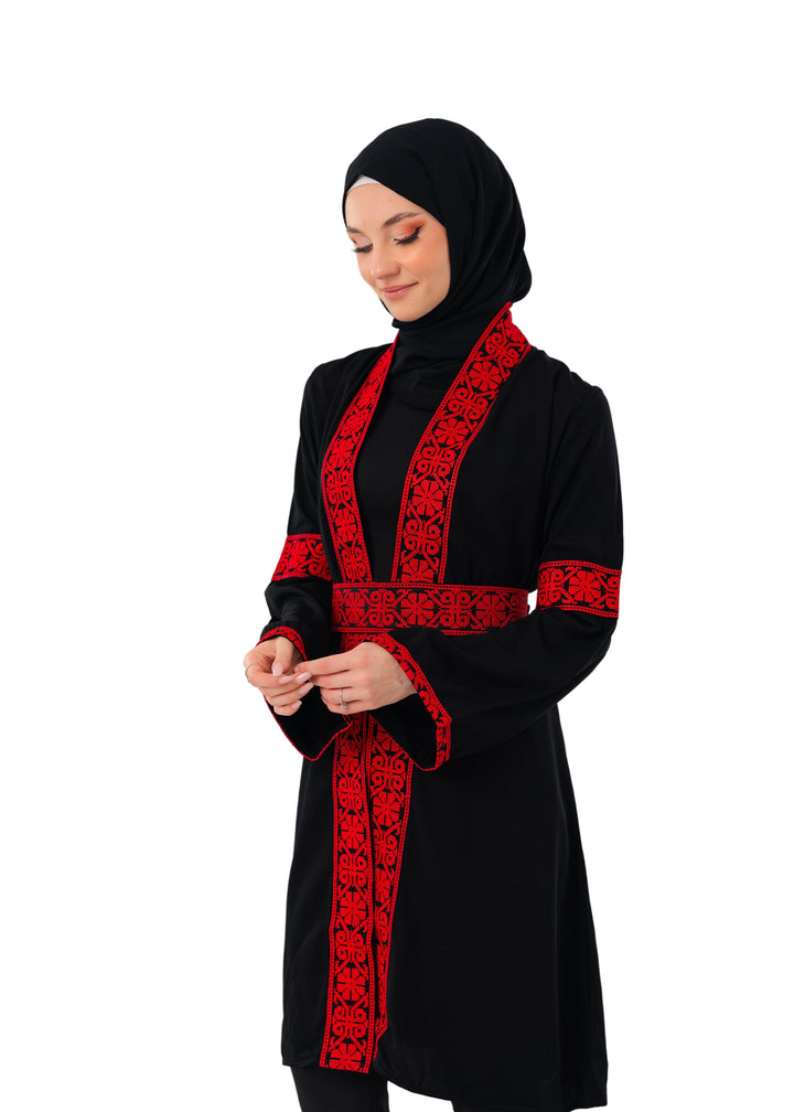 This elegant short abaya features intricate red embroidery on a classic black fabric, reflecting the rich cultural heritage of Palestine. Designed for both style and comfort, it offers a unique blend of traditional artistry and modern wearability. Perfect for those seeking a distinctive piece that honors Palestinian craftsmanship while providing a versatile addition to any wardrobe.