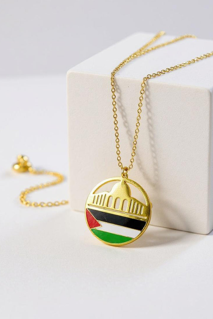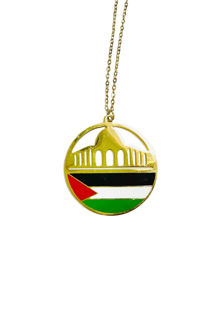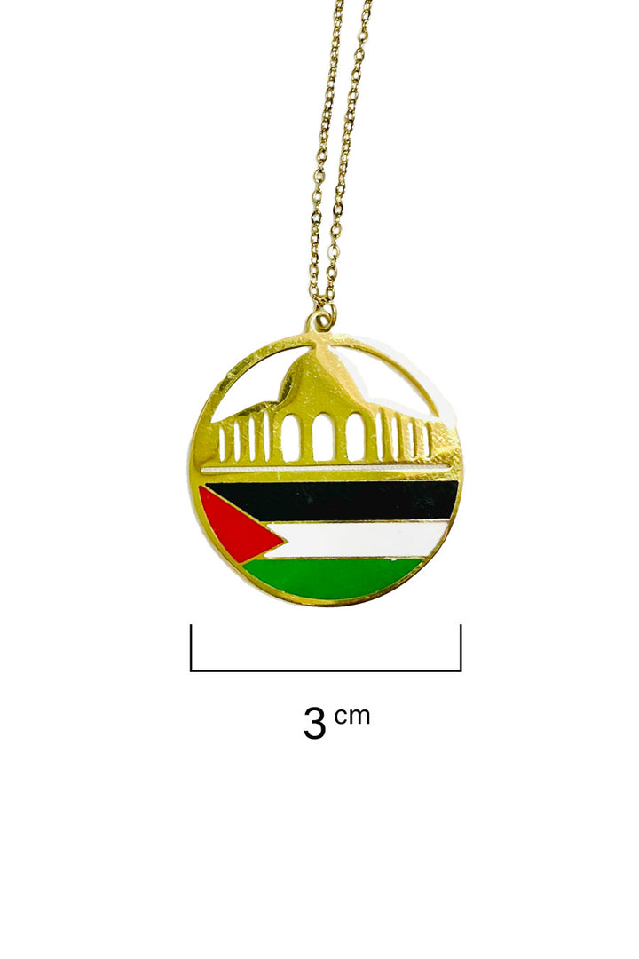 Carry a piece of Al-Quds Al-Sharif, the pulsating heart of Palestine, close to your heart with this luxurious golden necklace. The necklace features a masterfully crafted circular pendant made from gleaming golden metal, encapsulating the majestic golden Dome of the Rock with its captivating architectural details. The beauty of the design is completed by the vibrant colors of the Palestinian flag (red, green, white, black) in the lower part of the circle, giving it a profound national and spiritual character. This necklace is more than just an adornment; it is a symbol of pride, steadfastness, and spiritual connection to one of the holiest places on Earth. Suspended from an elegant golden chain, this necklace is an ideal gift expressing deep love for Palestine, its rich heritage, and its unwavering faith.