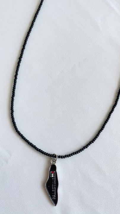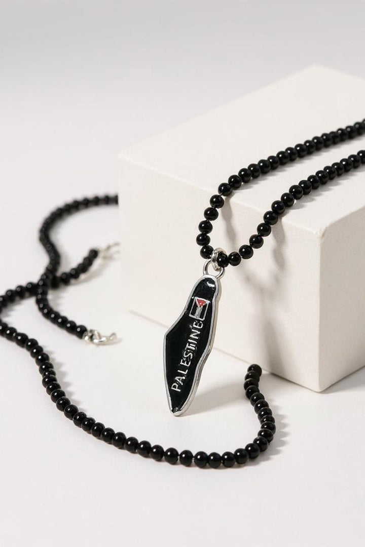 Add a touch of authenticity and strength to your look with this unique necklace inspired by Palestine's rich history. The necklace features an elegant chain of sleek black beads, symbolizing steadfastness, determination, and a rich history of struggle. Centered on the necklace is a polished metallic pendant in the shape of the Palestine map, shining in deep black and adorned with the vibrant colors of the Palestinian flag, with the word "PALESTINE" engraved on it to reinforce identity. This necklace is more than just an accessory; it is an expression of deep belonging and ancient heritage, and an ideal gift for anyone who carries Palestine in their heart and wishes to carry a part of it with them wherever they go.