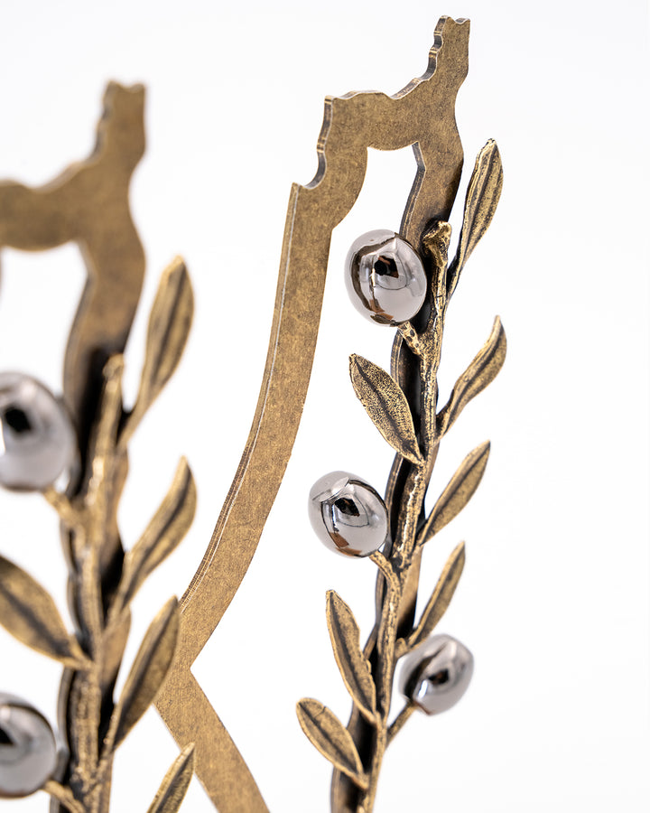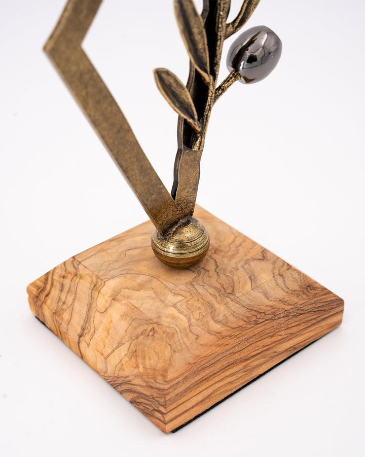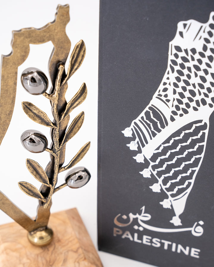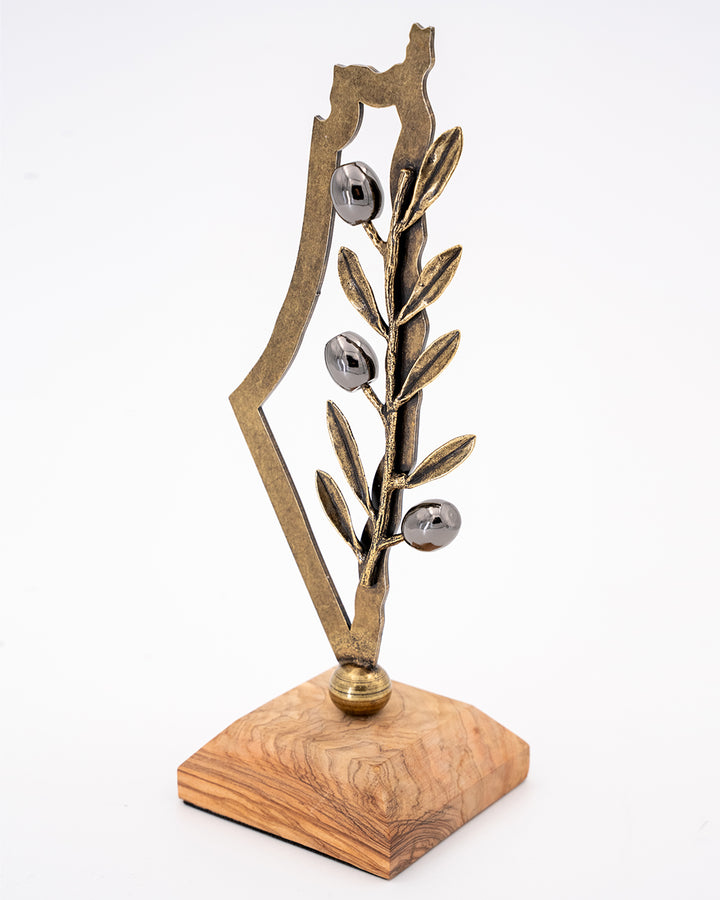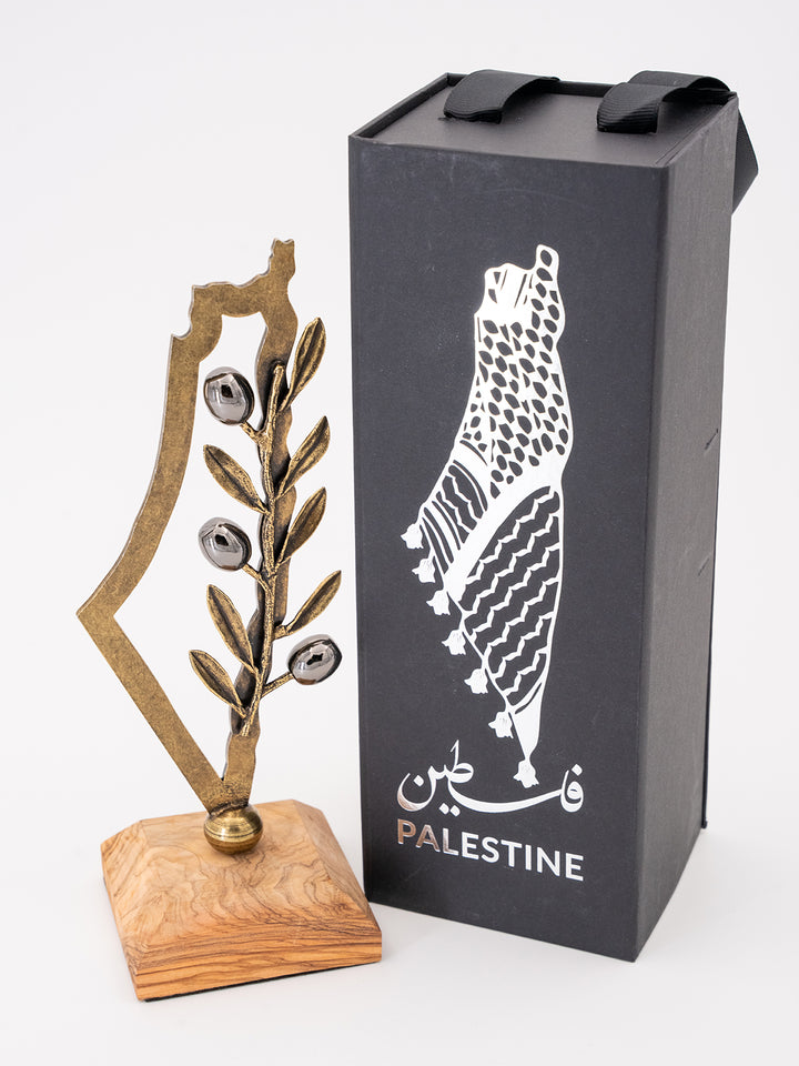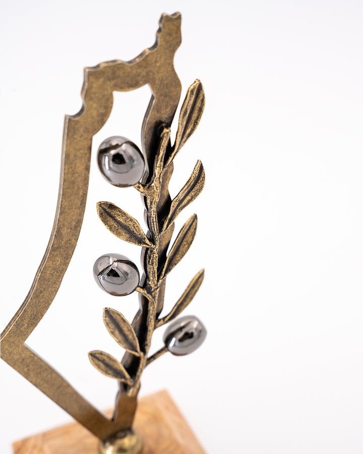 Celebrate identity and resilience with this artistic bronze map of Palestine. Crafted from bronze-plated brass, the piece features a beautifully designed olive branch with black olives, symbolizing rooted heritage and peace.