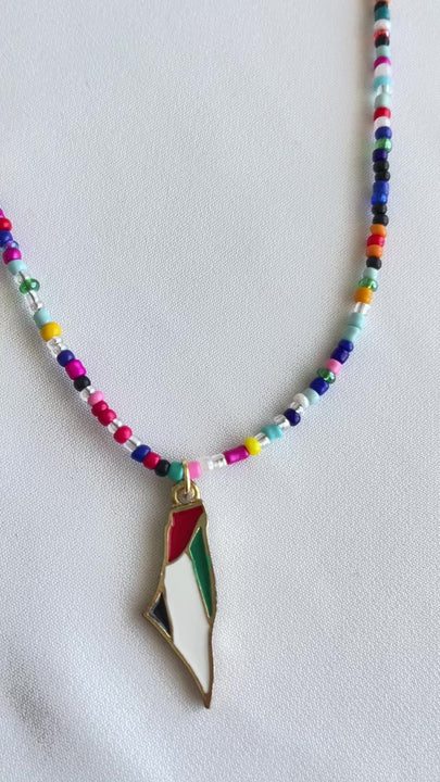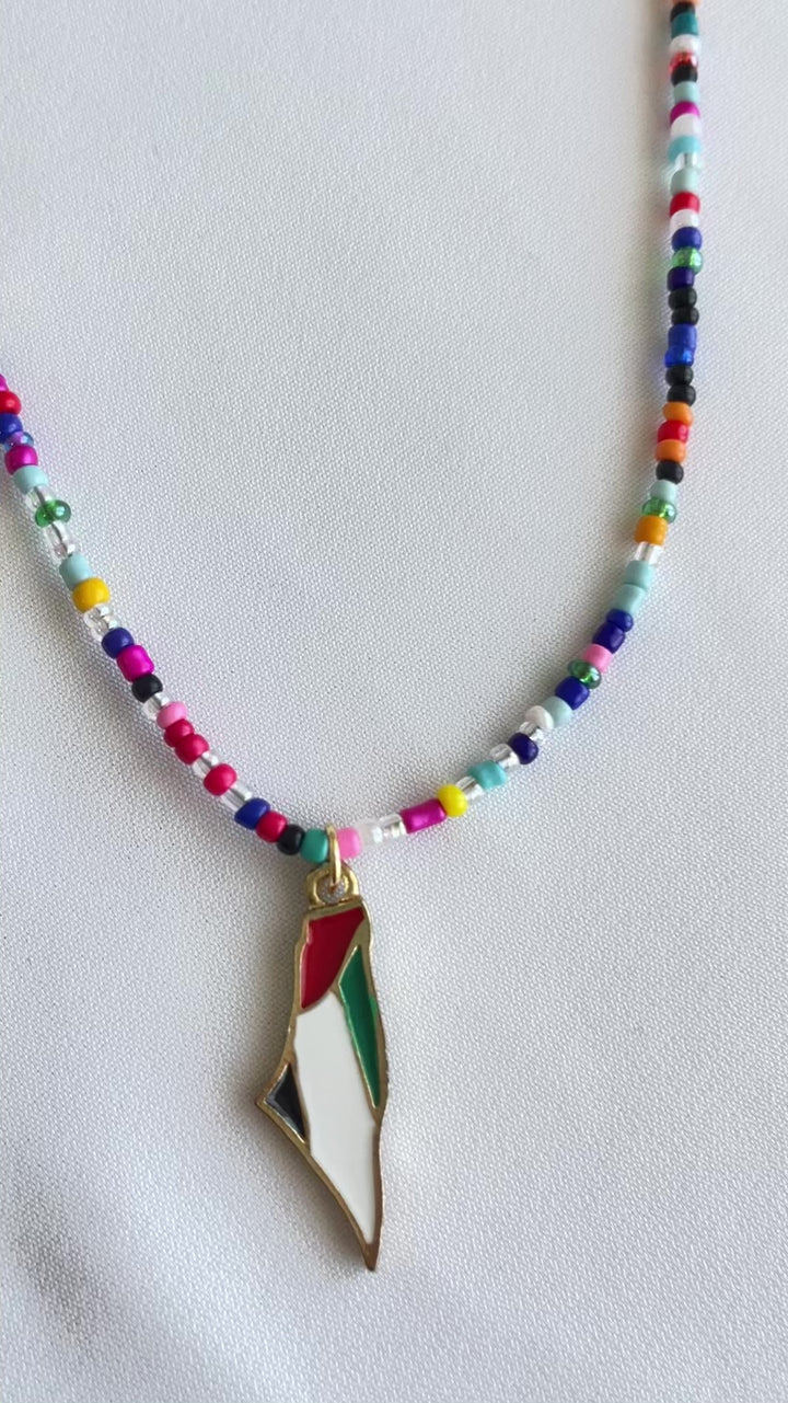 Add a touch of joy and optimism to your look with this vibrant necklace, combining colorful beauty with profound meaning. The necklace features a unique chain of various colorful beads, reflecting the richness and diversity of Palestinian culture, and adding a lively touch to any outfit. Centered on the necklace is a polished metallic pendant in the shape of the Palestine map, shining with the vivid colors of the Palestinian flag (green, red, white, black), with the word "PALESTINE" engraved on it to reinforce identity. This necklace is not just a trendy accessory; it is an artistic piece that tells a story of steadfastness, hope, and beauty rooted in every corner of Palestine. Make it your daily companion, or offer it as a special gift expressing an unending passion for the land of ancestors.