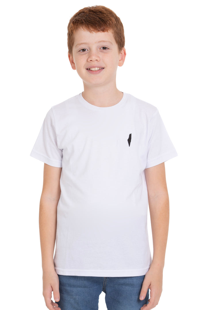 The T-shirt features a bright white color and 100% cotton fabric, ensuring superior lightness and softness on sensitive children's skin, making it highly suitable for warm weather. The design is simple with a classic round neck, and precise embroidery of the map of Palestine in black, elegantly centered on the chest area.