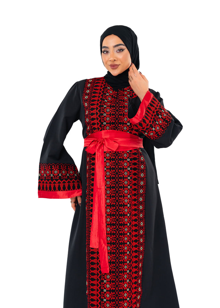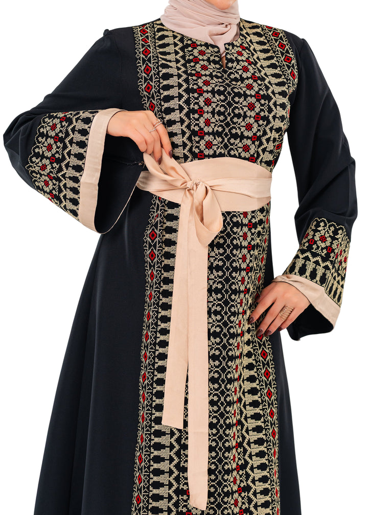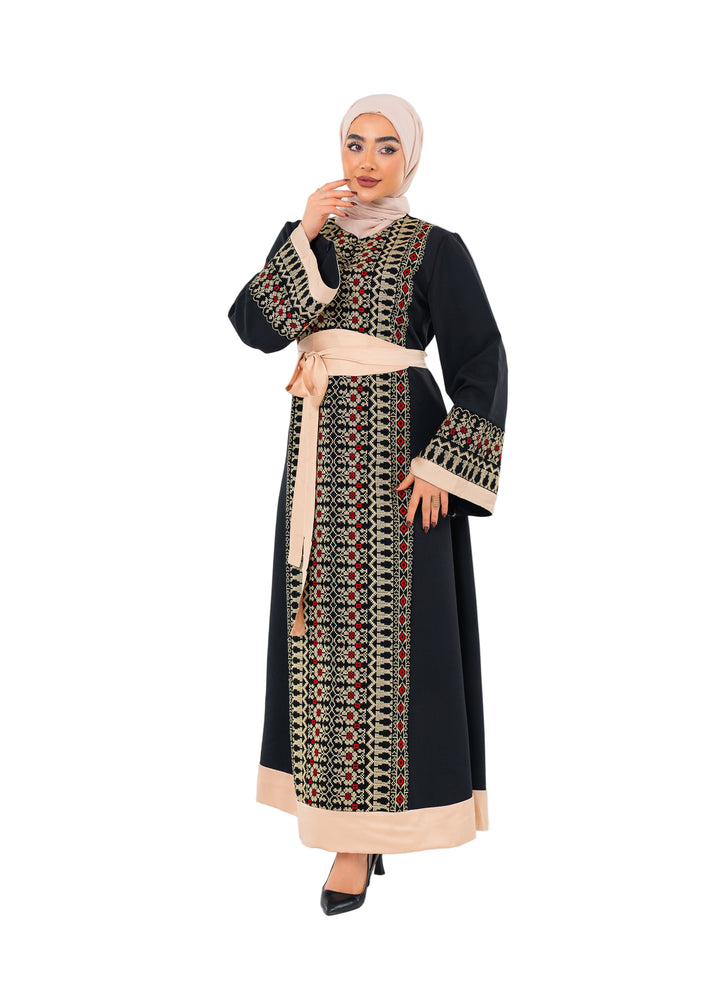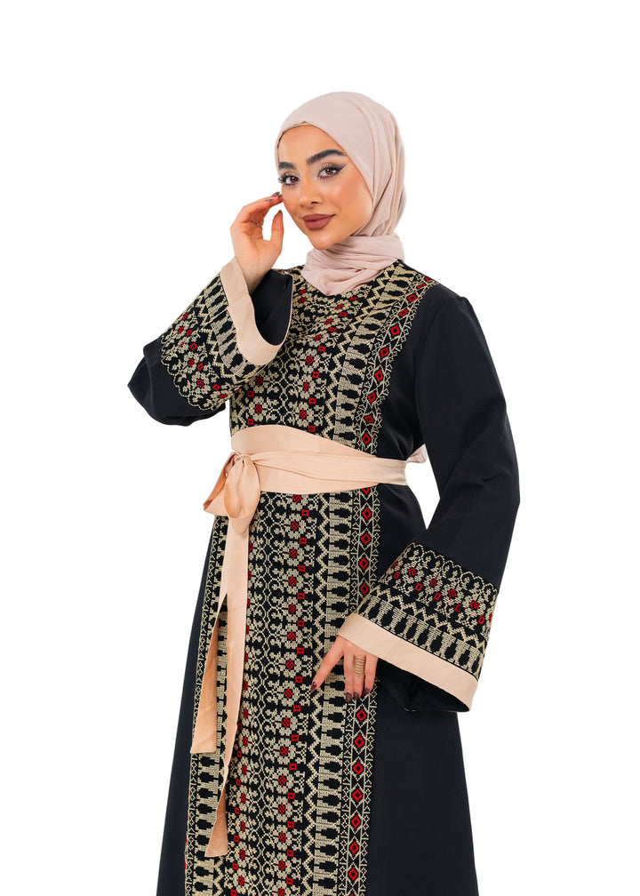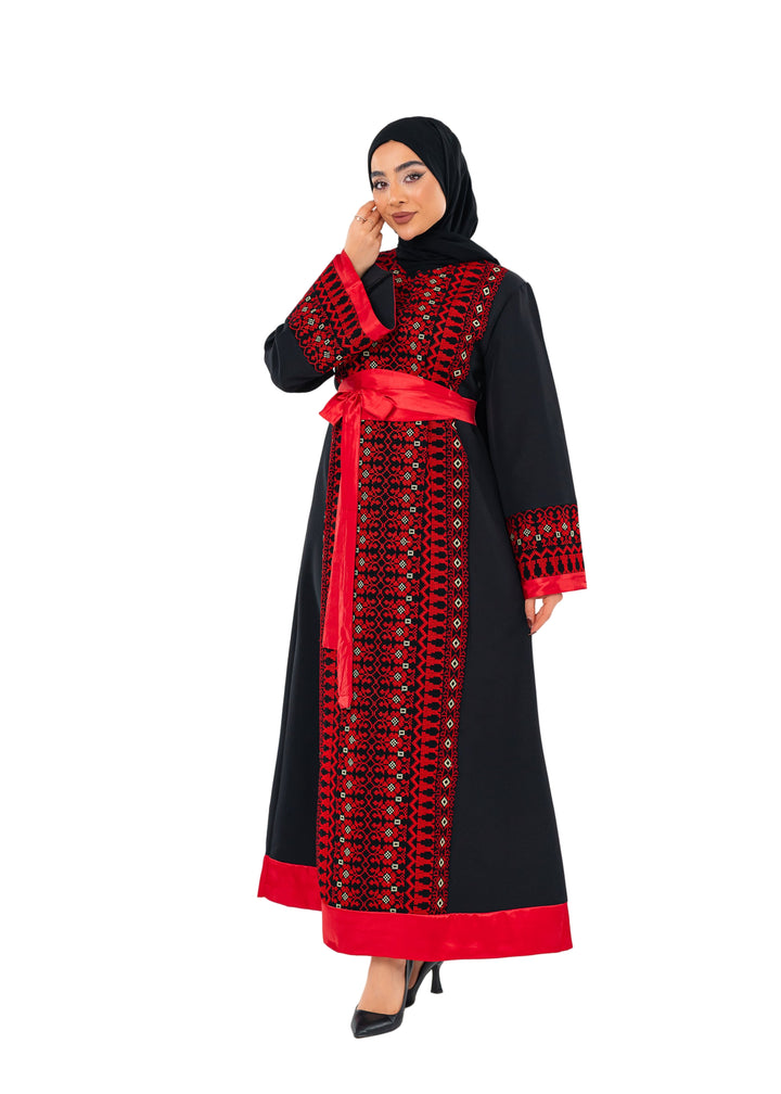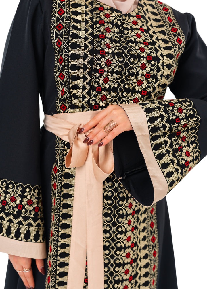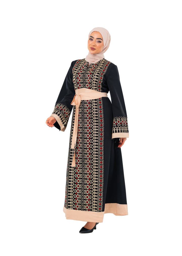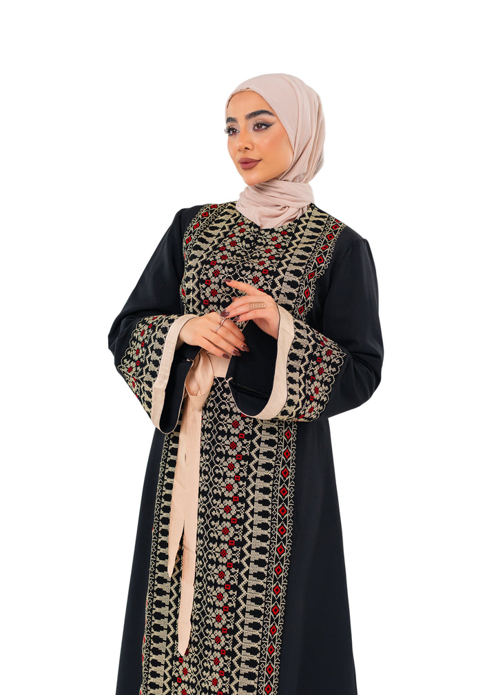 This elegant thobe combines the serene elegance of black with traditional Palestinian embroidery, enriched by modern satin fabric details. It offers both modesty and luxury, making it an ideal choice for formal events and evening celebrations.