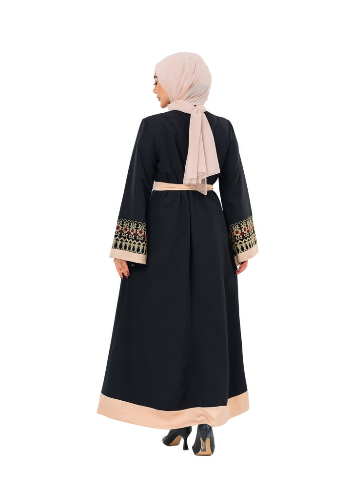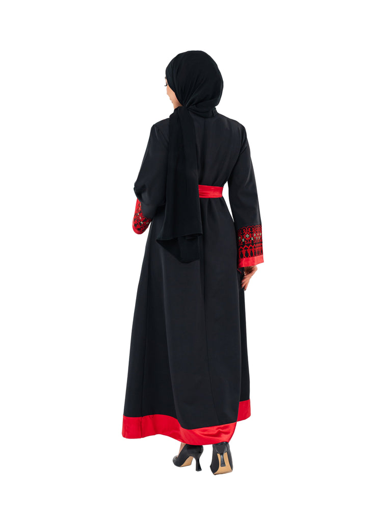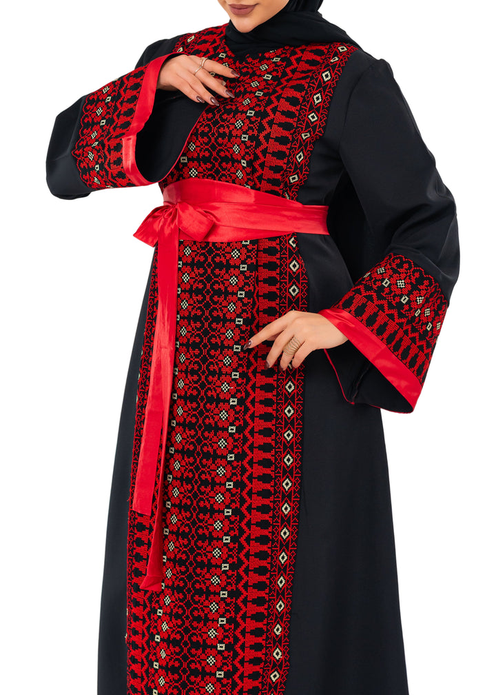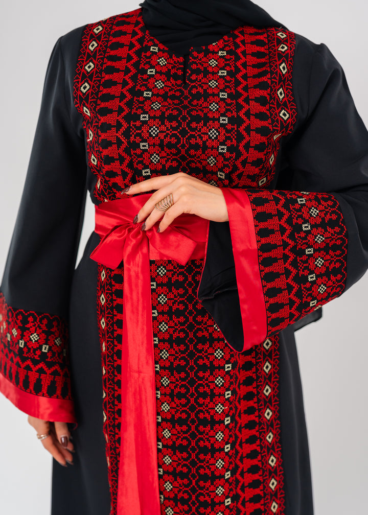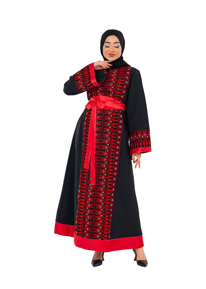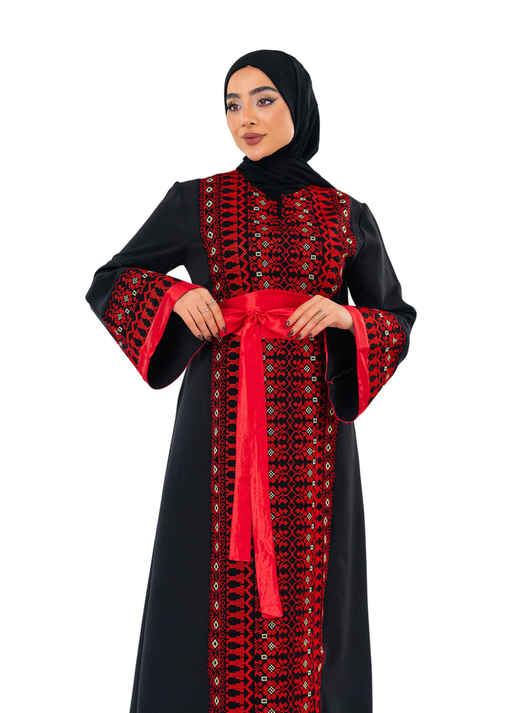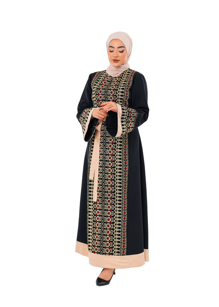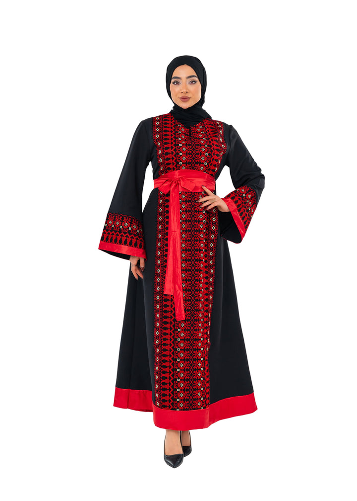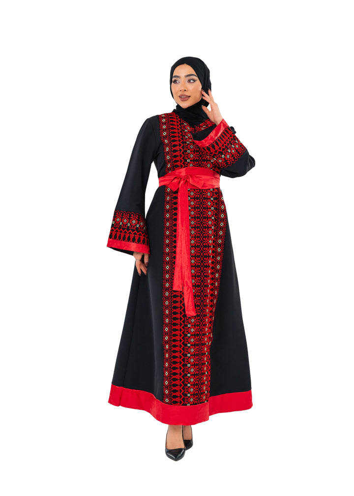 This elegant thobe combines the serene elegance of black with traditional Palestinian embroidery, enriched by modern satin fabric details. It offers both modesty and luxury, making it an ideal choice for formal events and evening celebrations.