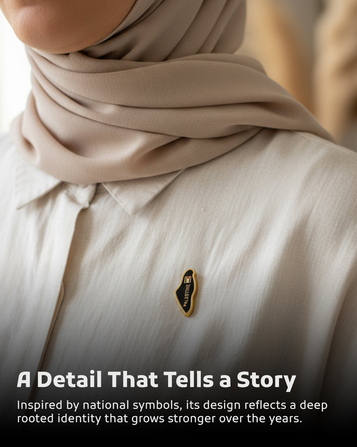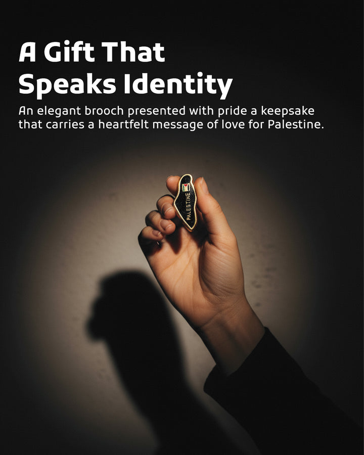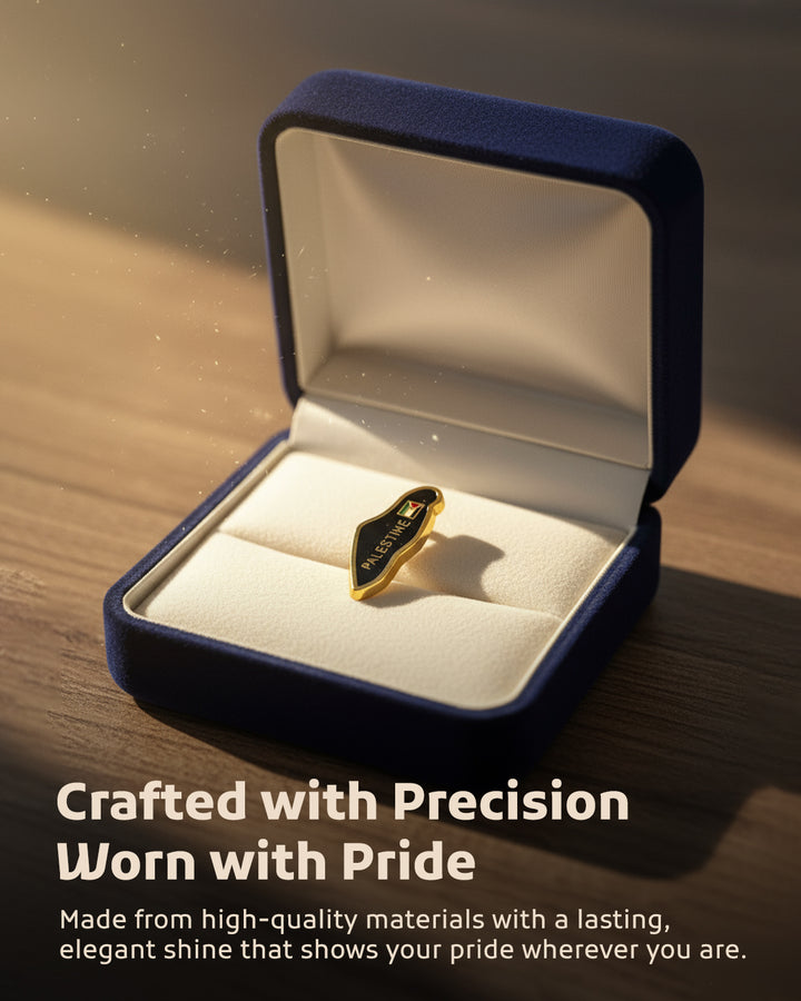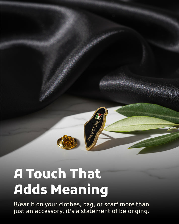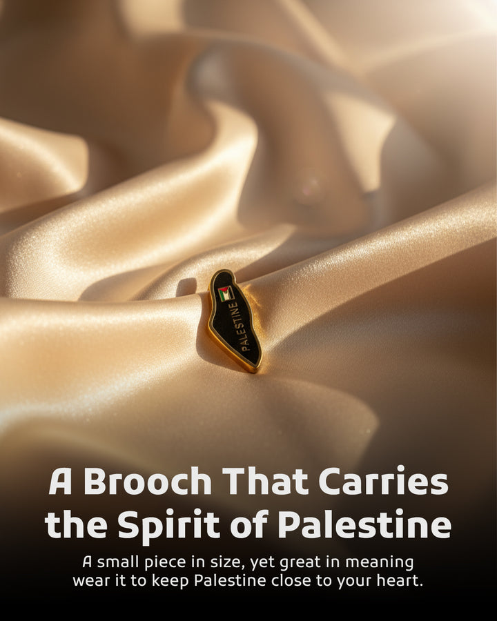 An elegant pin (brooch) shaped like the map of Palestine, designed in an elegant black color that symbolizes determination and steadfastness, and encircled by a stylish golden frame that clearly highlights the map's outline. The Palestinian flag, with its vivid colors, is centered on the pin, and the word "PALESTINE" is clearly displayed in golden font on the side, making it a distinctive piece that expresses Palestinian identity and heritage.