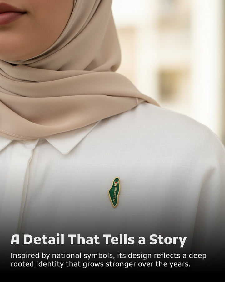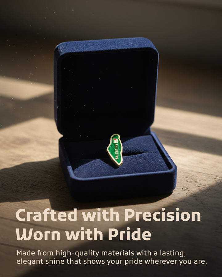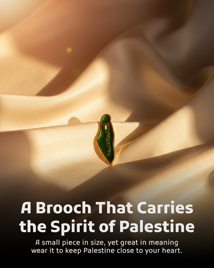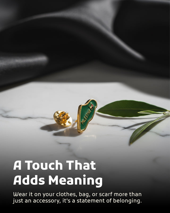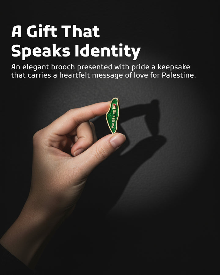 An elegant pin (brooch) shaped like the map of Palestine, designed in a rich green color symbolizing the fertility of the land, and encircled by a stylish golden frame that clearly highlights the map's outline. The Palestinian flag, with its vibrant colors, is centered on the pin, and the word "PALESTINE" is clearly displayed in golden font on the side, making it a distinctive piece that expresses Palestinian identity and heritage.