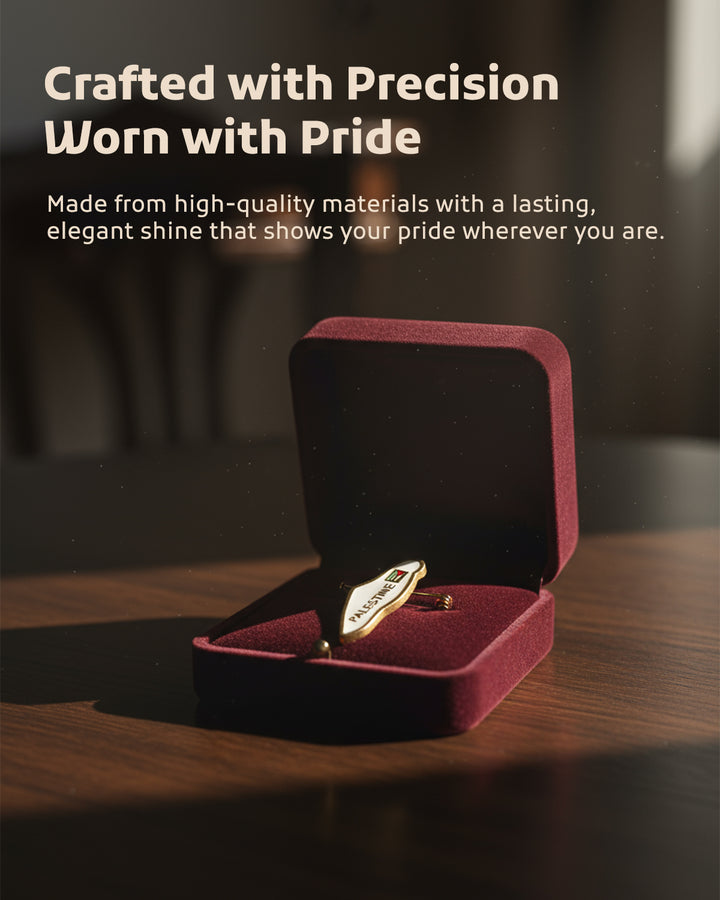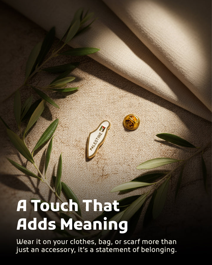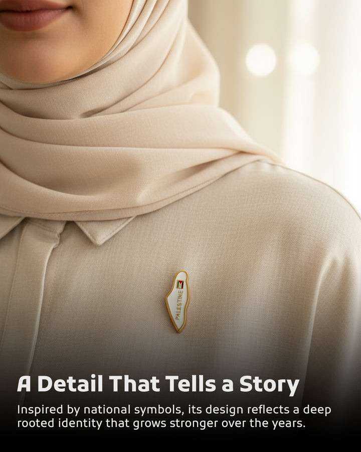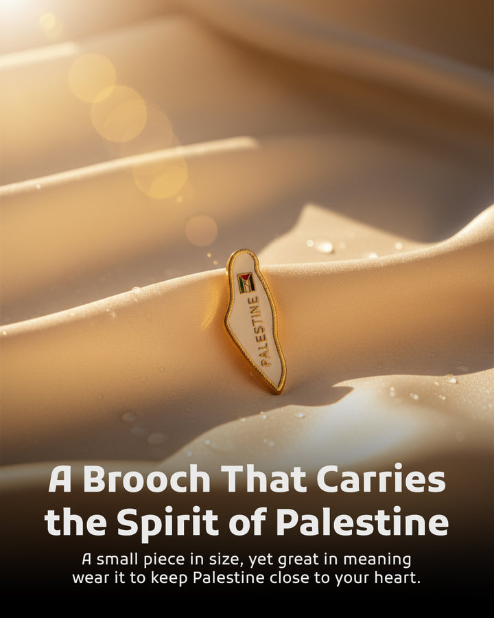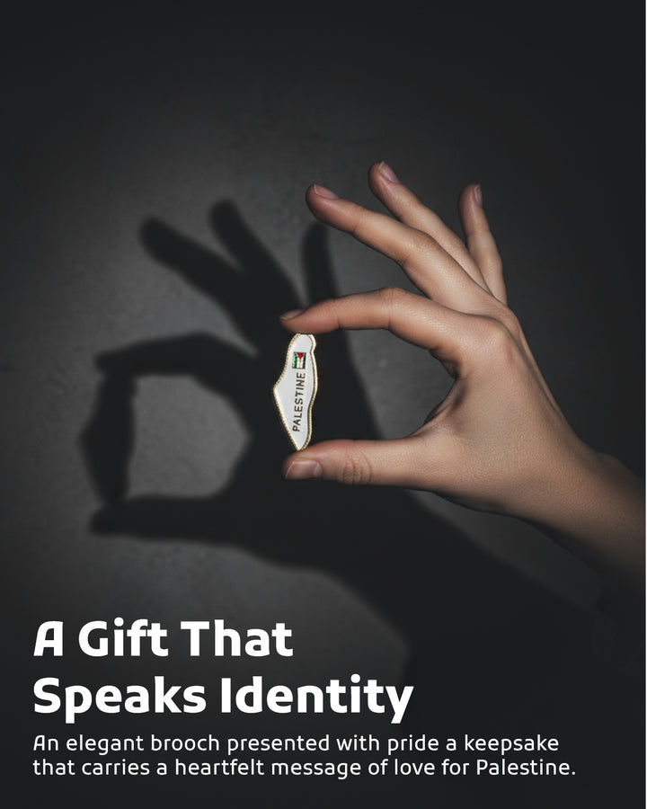 An elegant pin (brooch) shaped like the map of Palestine, designed in a pure white color that symbolizes peace and hope, and encircled by a stylish golden frame that clearly highlights the map's outline. The Palestinian flag, with its vivid colors, is centered on the pin, and the word "PALESTINE" is clearly displayed in golden font on the side, making it a distinctive piece that expresses Palestinian identity and heritage.