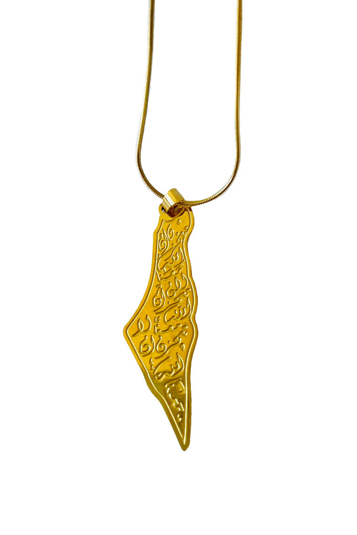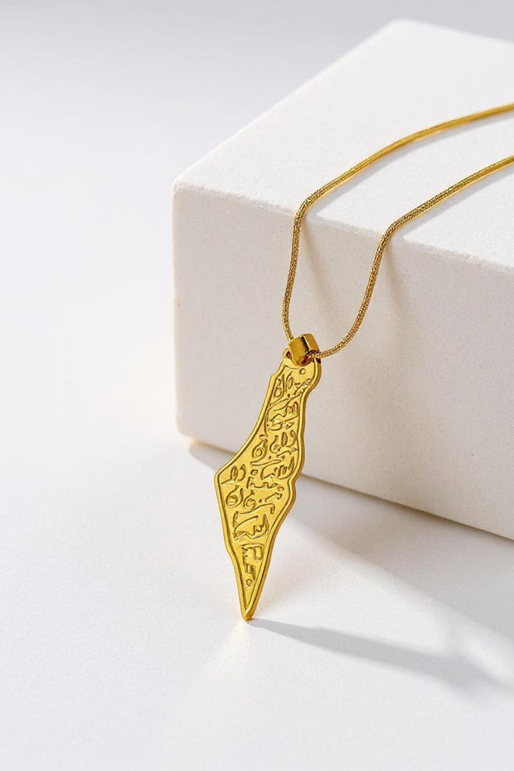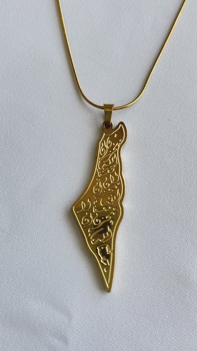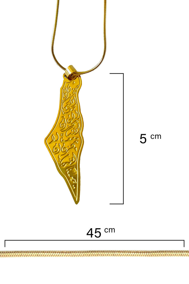 Wear a piece of hope and faith with this exceptional golden necklace, combining the sanctity of the land with the depth of its message. The necklace features an elegant design in the shape of the Palestine map, meticulously crafted and plated with gleaming gold, giving it an eternal radiance. What truly distinguishes it, however, is the prominent inscription within the map's borders of the noble Quranic verse "Do not grieve; indeed, Allah is with us" (لا تحزن إن الله معنا) in beautiful, authentic Arabic calligraphy. This necklace is not merely an adornment; it is a constant reminder of patience, trust in victory, and divine support, serving as a source of strength and reassurance for whoever wears it. Suspended from a delicate and modern golden chain, this necklace is an invaluable spiritual and moral gift for those who carry Palestine in their hearts and seek hope every day.