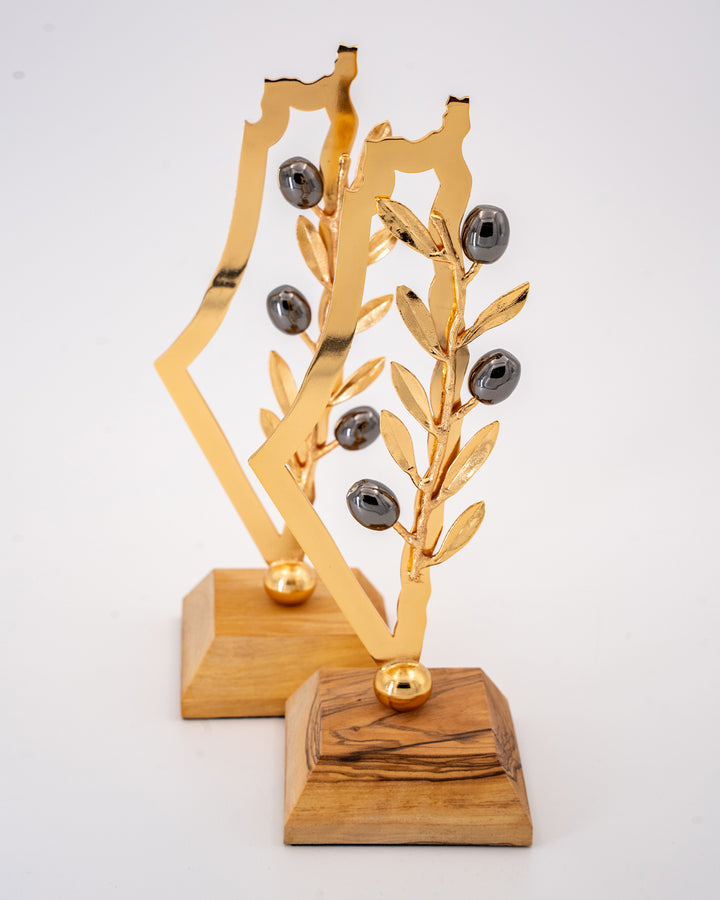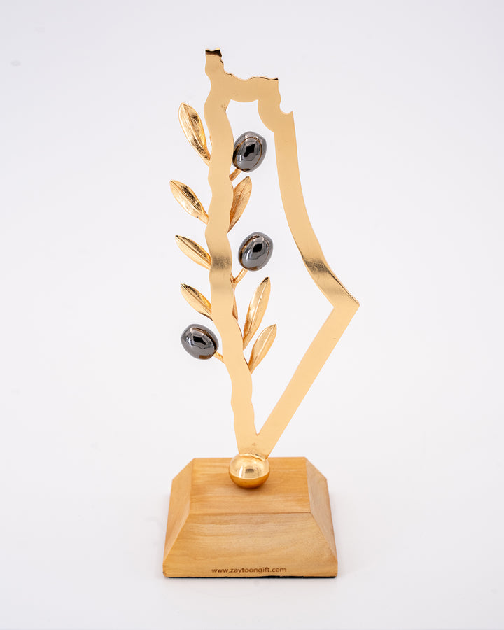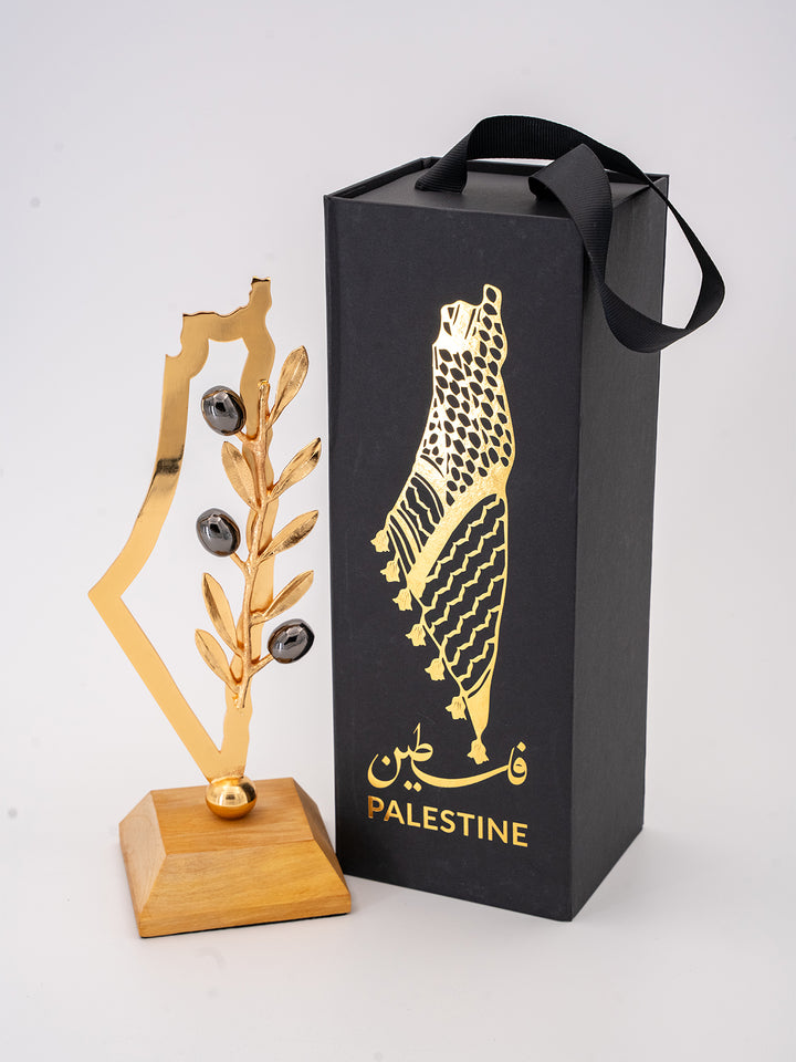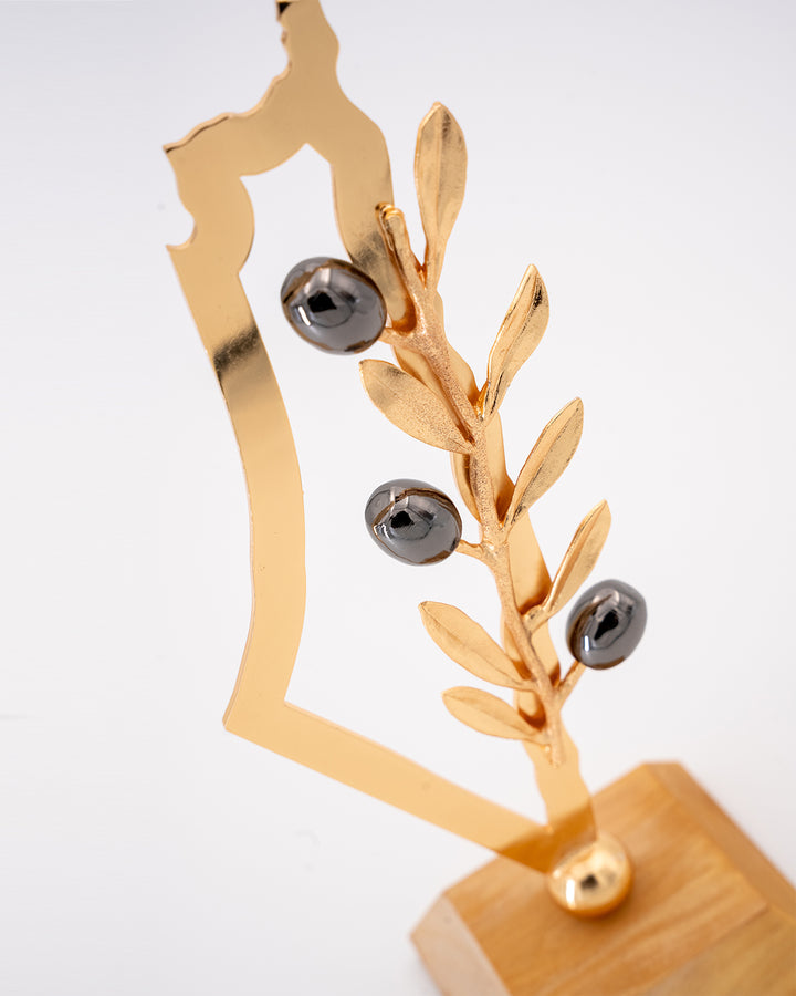 A stunning piece that blends elegance and heritage. This map of Palestine is precisely crafted from gold-plated brass, accented with a graceful olive branch featuring black olives, symbolizing peace and national identity.