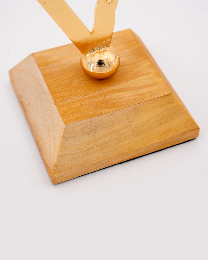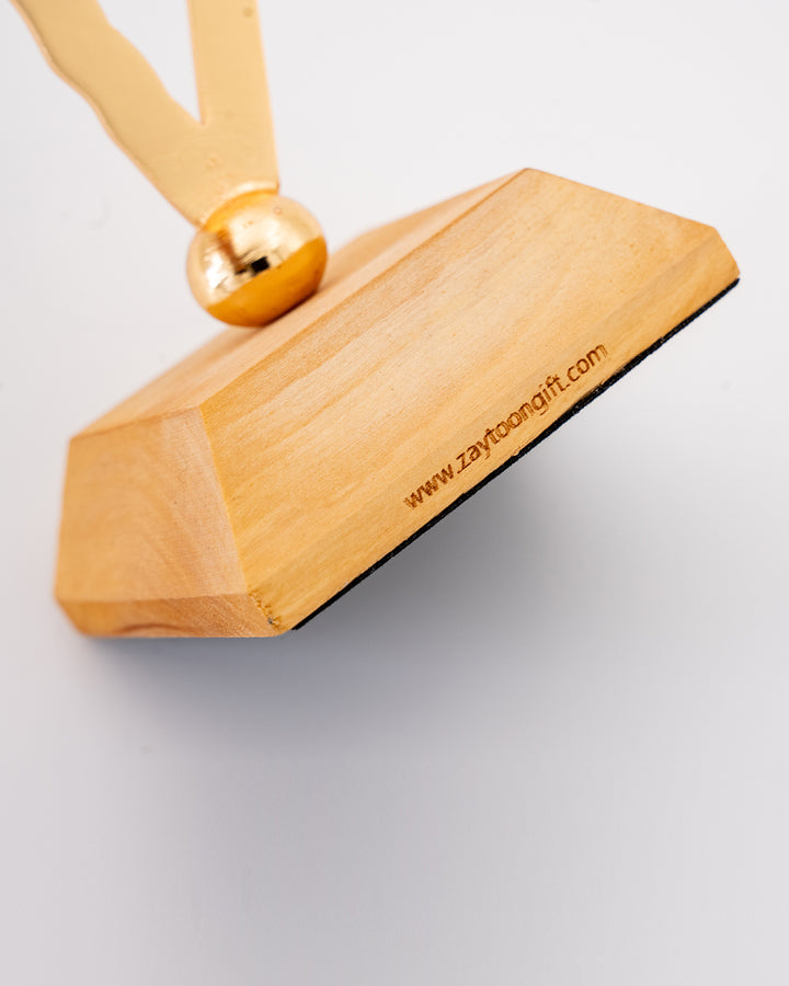 The design stands on a base made of authentic olive wood, known for its rich grain and deep cultural symbolism.