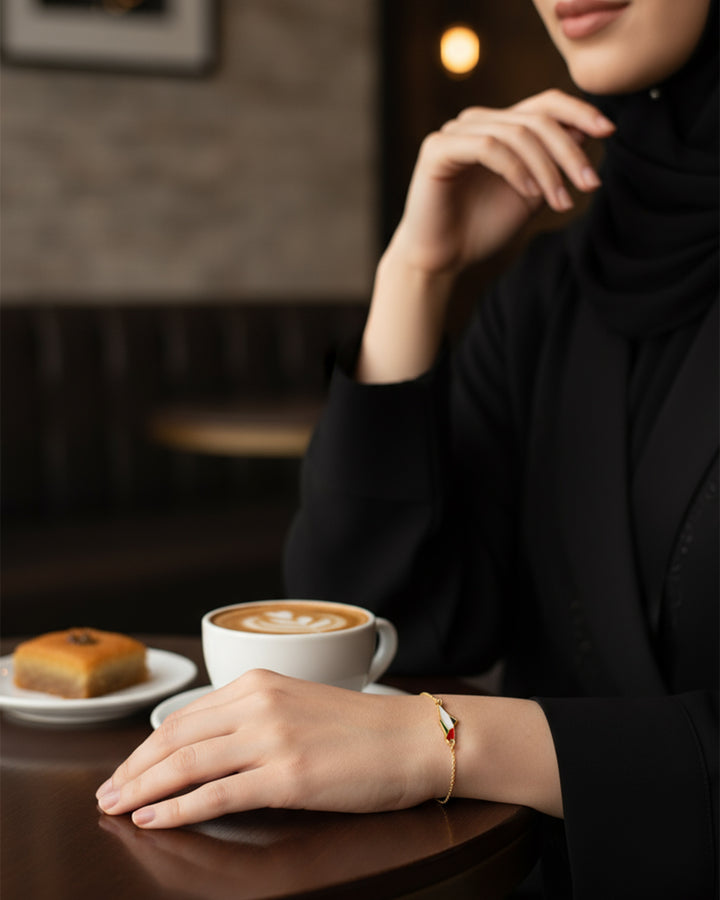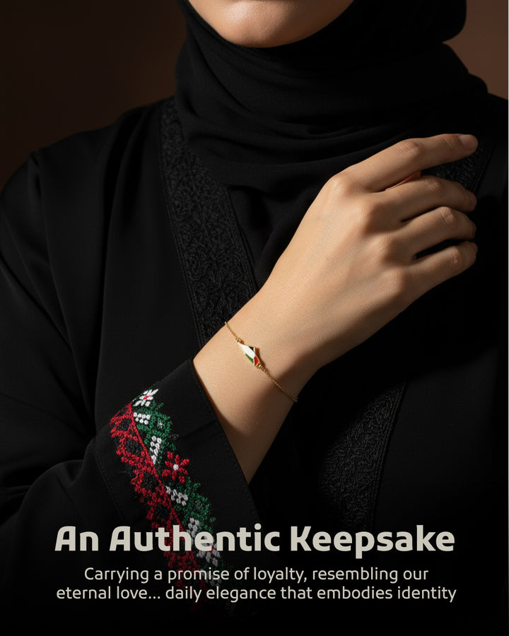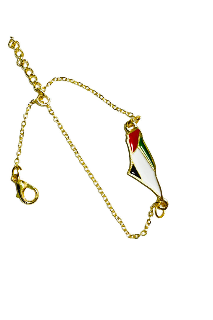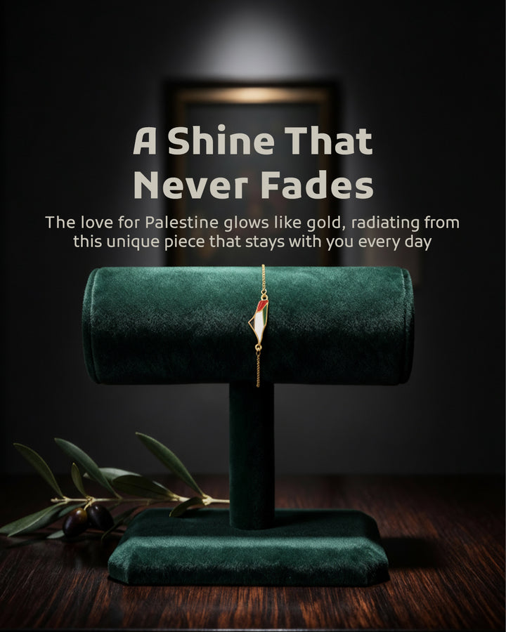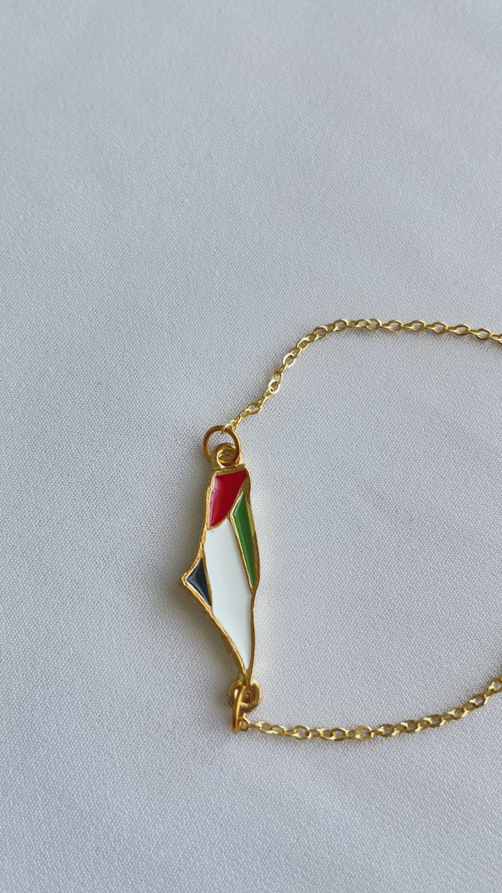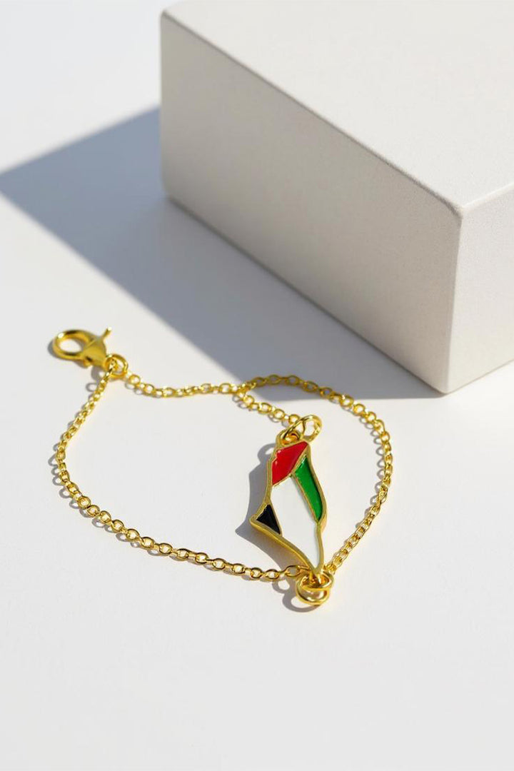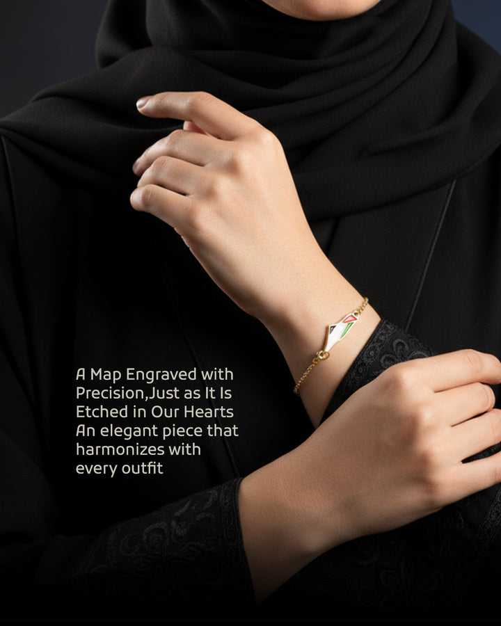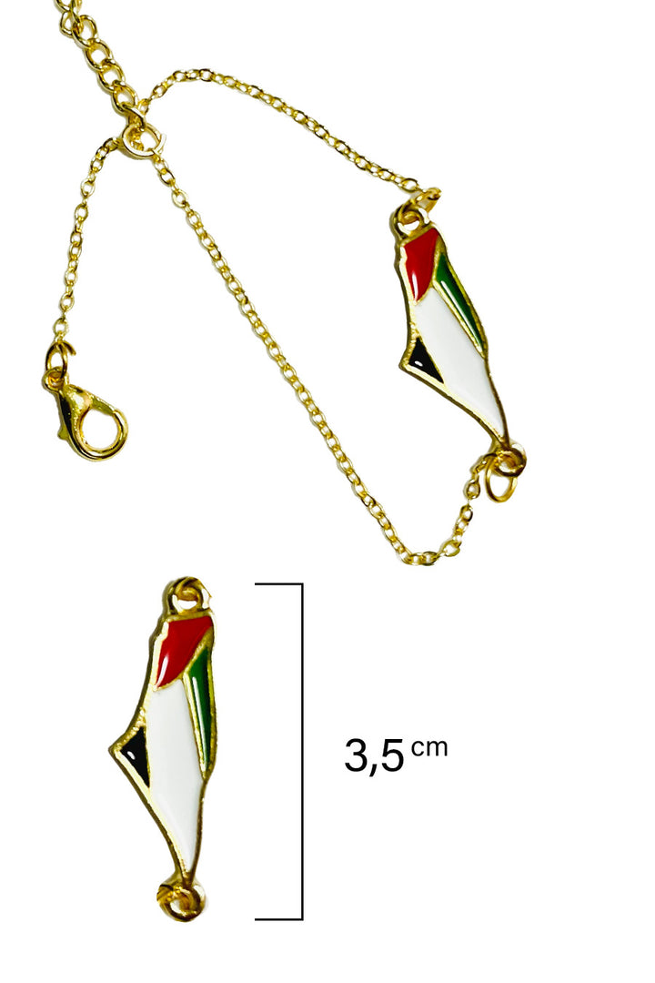 Carry a piece of the land of olives and history around your wrist with this elegant bracelet featuring a unique design. The bracelet showcases a central piece shaped like the map of Palestine, skillfully crafted and plated with gleaming gold, adding a touch of luxury and sophistication. The map is adorned with the vibrant colors of the Palestinian flag, making it a powerful and expressive symbol of national belonging and pride. A delicate, adjustable golden chain dangles from the bracelet to fit various wrist sizes, securing with a practical and safe clasp. This bracelet is not just a beautiful accessory; it is an artistic piece that tells the story of a land and its people, and an ideal gift for those who cherish Palestine and wish to carry a part of it with them always.