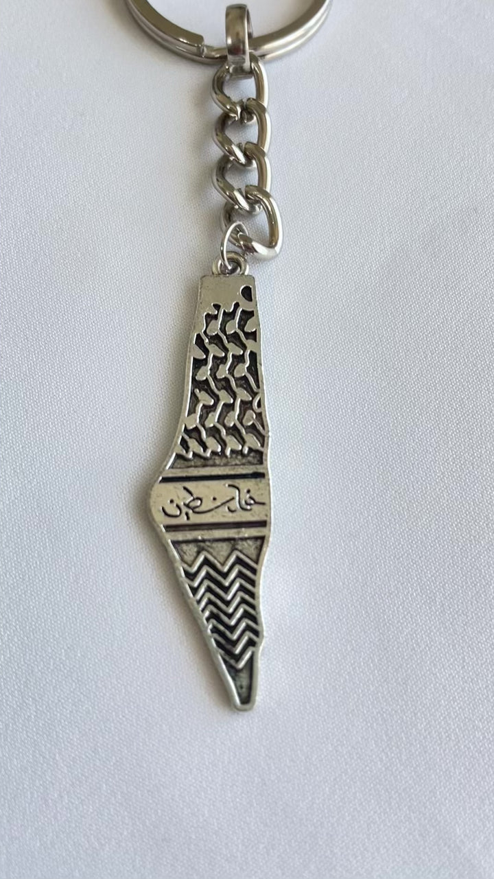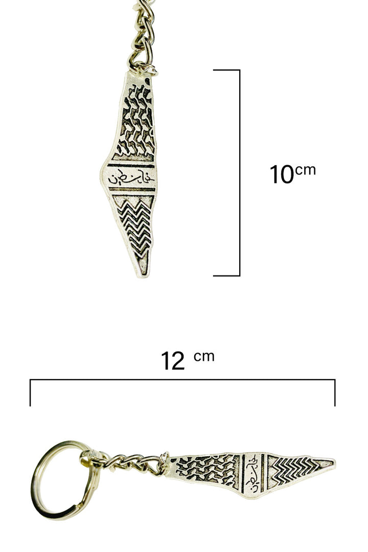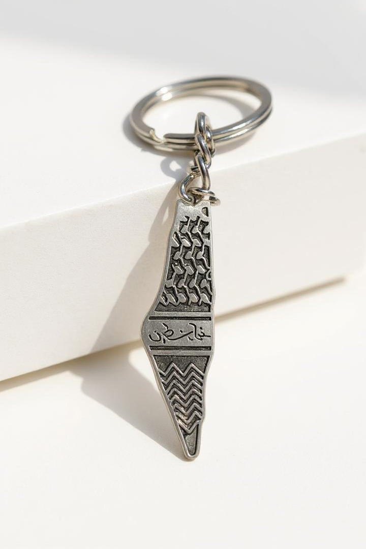 Acquire an artistic piece that embodies the spirit and ancient heritage of Palestine with this unique silver keychain. Designed in the shape of the map of Palestine, its surface is adorned with the distinctive patterns of the authentic Palestinian Keffiyeh, symbolizing steadfastness, identity, and the fellahin (farmers). Every line and engraving on this keychain tells the story of a land and its people, lending it a deep artistic and historical character. Meticulously crafted to ensure durability and beauty, it is more than just a keychain; it is a statement of belonging and pride. Make it your daily companion, or offer it as a perfect gift for those who cherish Palestine and its rich heritage.