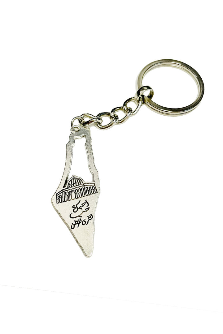 Palestine Map With Kubbatu Al Sahra And Arabic Proverb Silver Color Keychain Unisex A300050
