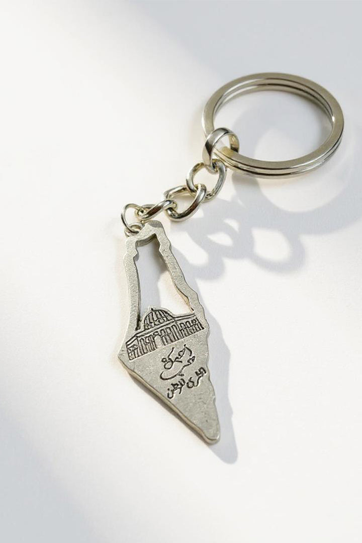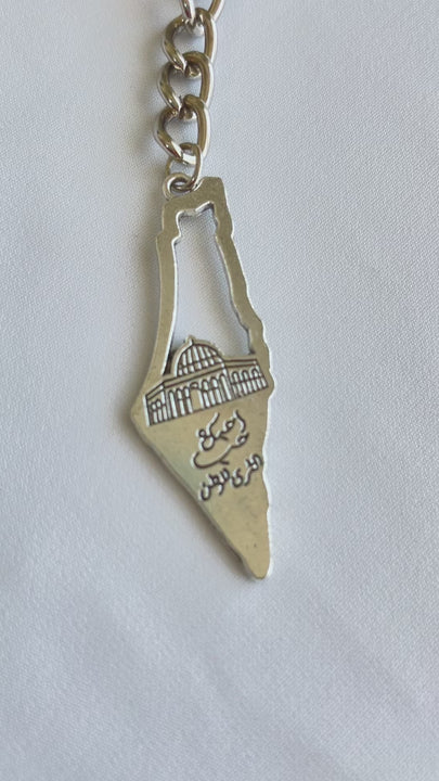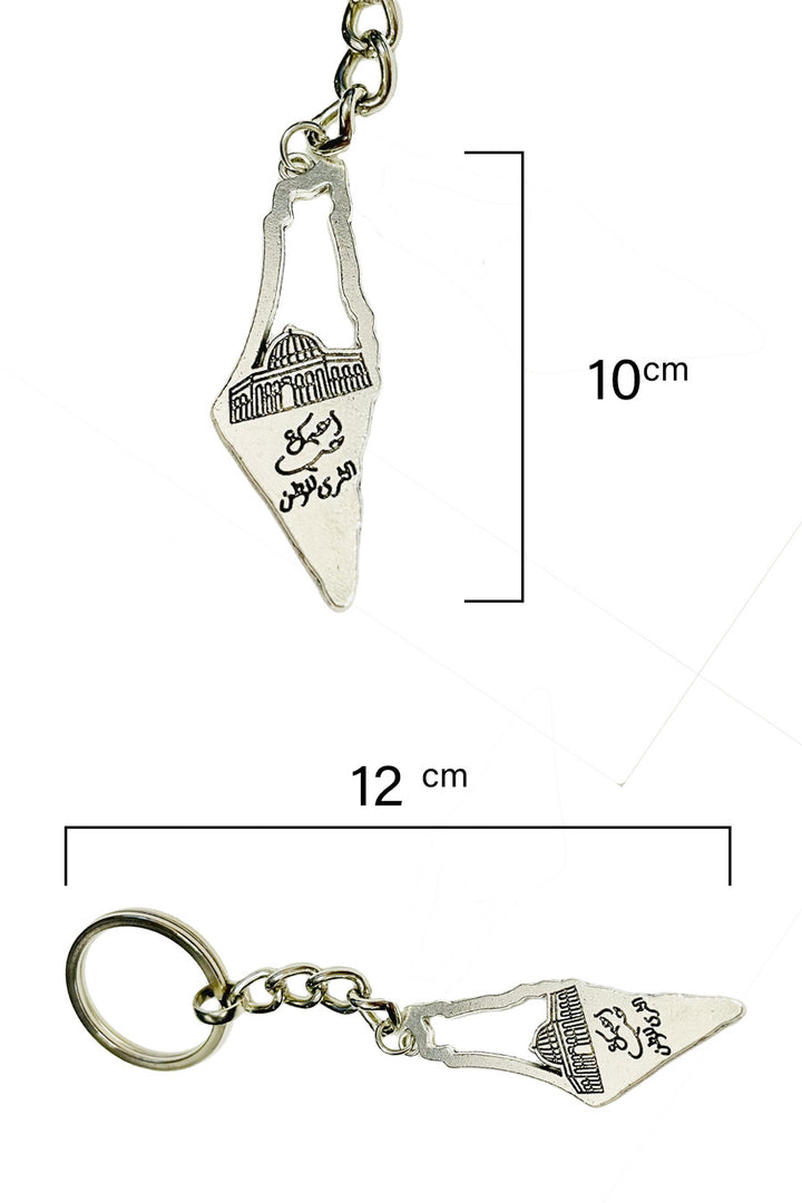 Acquire a symbol that unites the Holy Land with its pulsating soul with this silver Palestine map keychain, embracing the sacred Dome of the Rock within. This keychain is not merely an adornment; it is a living embodiment of belonging and loyalty, narrating the story of a land and its people. Meticulously crafted from gleaming silver metal, it beautifully highlights the contours of the Palestine map in its full splendor, with the captivating architectural details of the Dome of the Rock shining brightly at its heart. Make it your daily companion, to constantly remind you of Jerusalem and Palestine, or present it as a meaningful gift carrying the deepest sentiments of love and connection to the land and heritage. An artistic keychain that combines geography, history, and spirituality in one unique design.