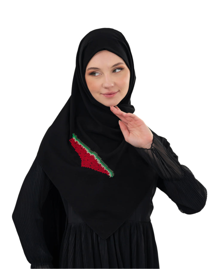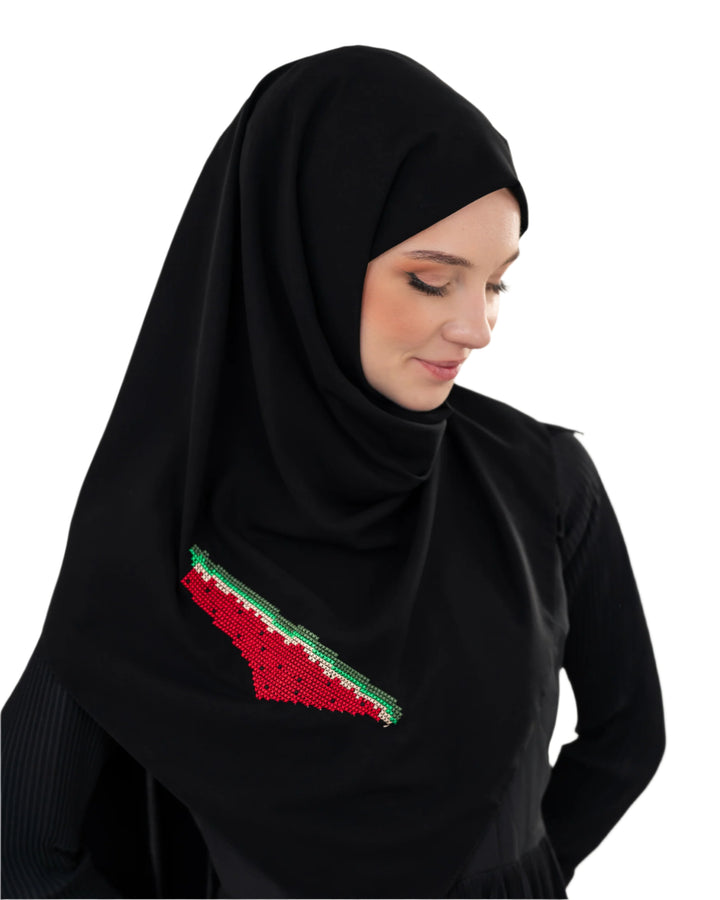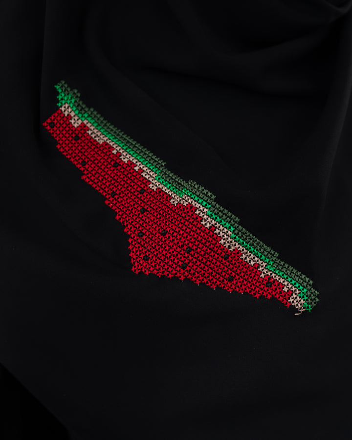 This black shawl is made from soft, high-quality polyester and features a beautifully hand-embroidered map of Palestine in watermelon colors — red, green, white, and black — a symbol of heritage, resistance, and solidarity.