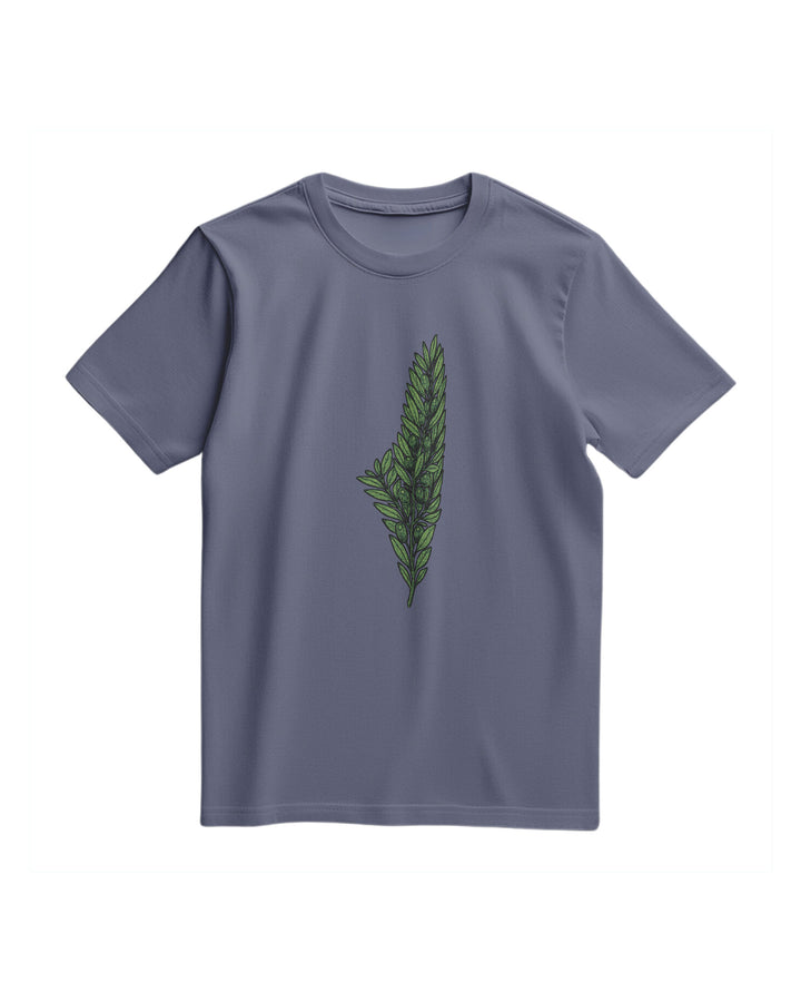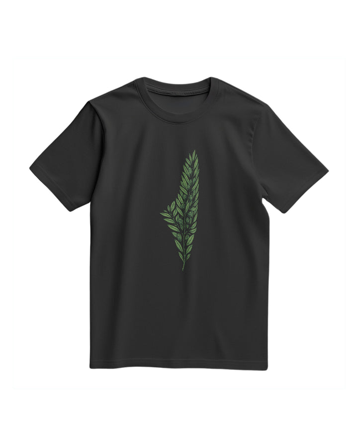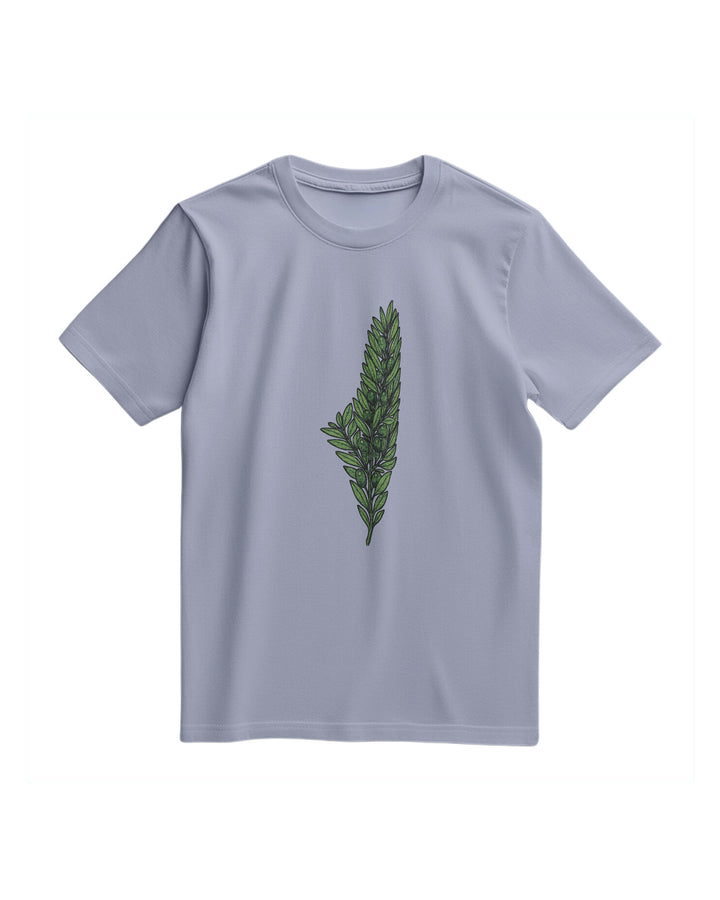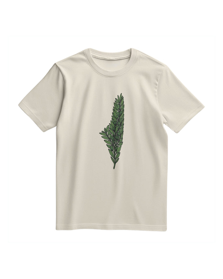 A T-Shirt With A Regular, Comfortable Fit And A Simple, Stylish Print At The Center Of The Chest. The Print Features An Olive Branch Drawn In Detailed, Neutral Colors, Shaped Like A Map Of Palestine. The Design Combines The Olives Deep Symbolism In Palestinian Culture With An Elegant And Appealing Artistic Expression Of National Identity. Fabric: 100% Cotton
