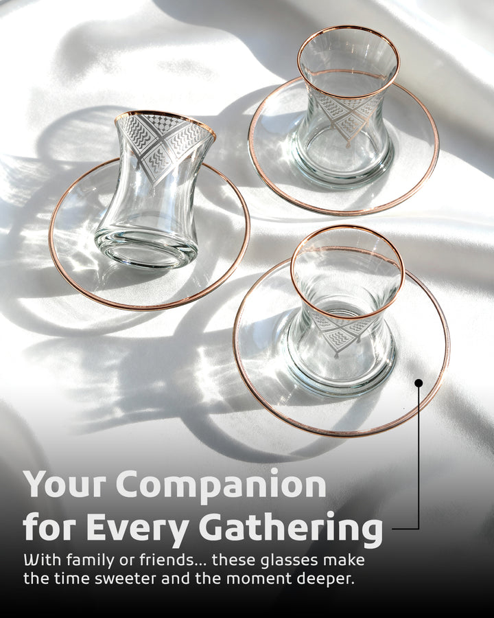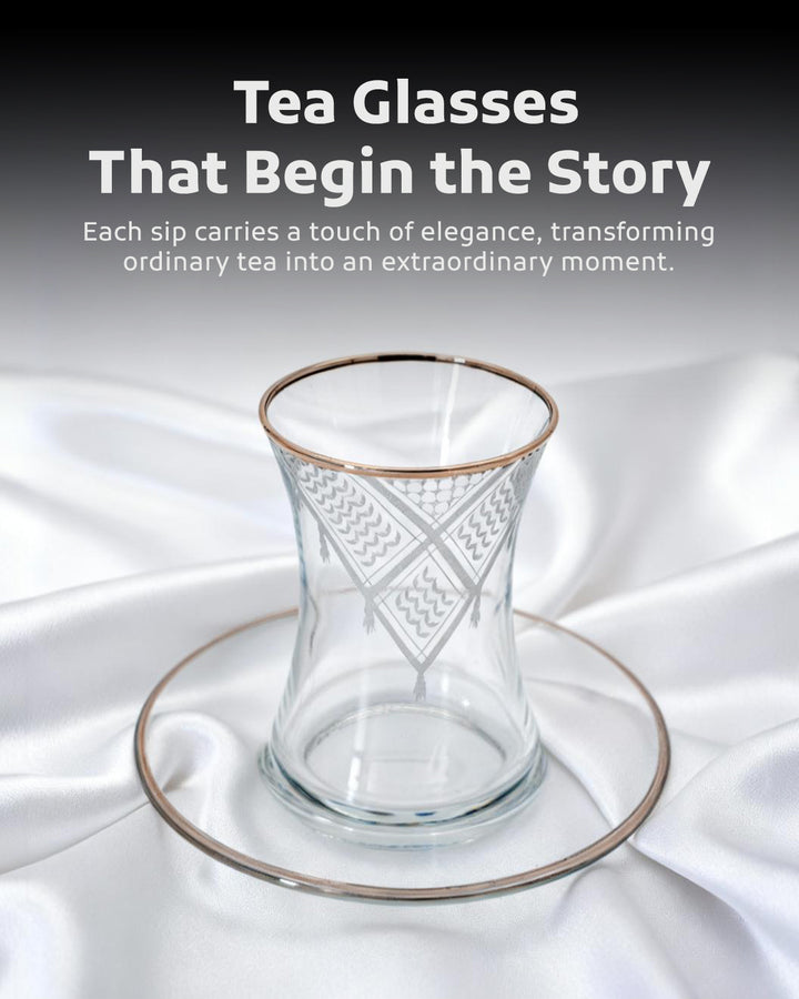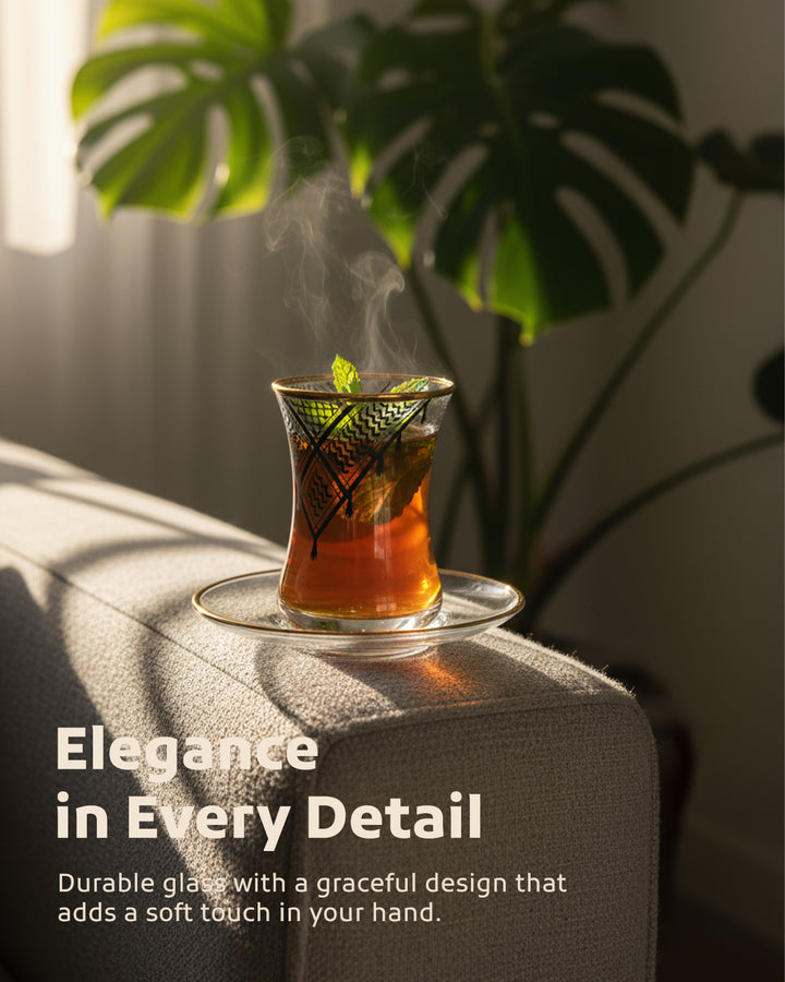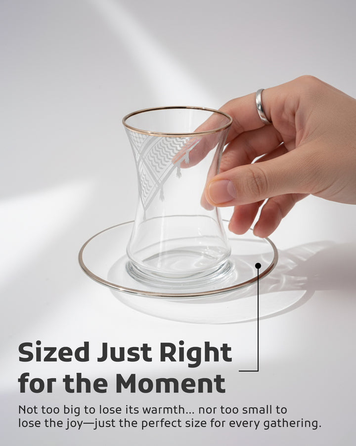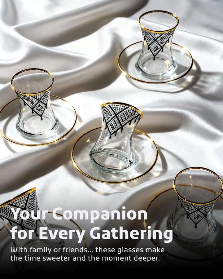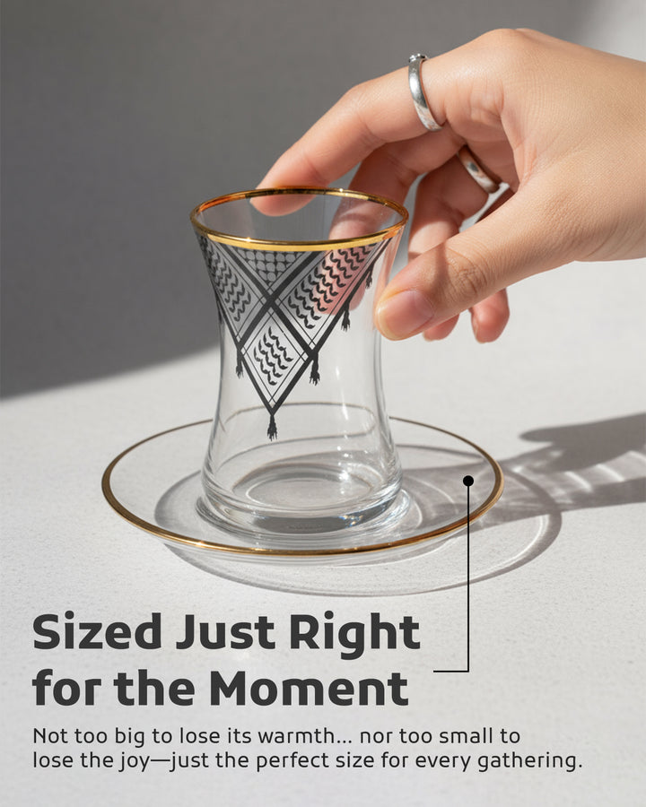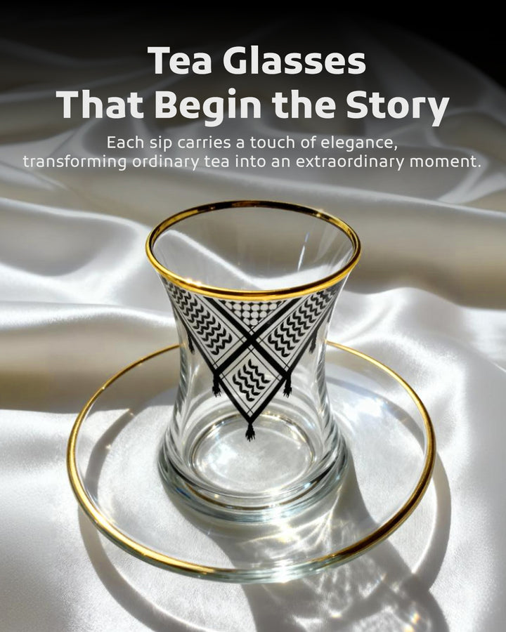 Acquire elegance and heritage with this tea glass set, designed to add a touch of authentic beauty to your tea-drinking experience. Each glass is adorned with intricate Palestinian Keffiyeh patterns, blending luxury with authenticity. The set comprises 6 elegant tea glasses and 6 matching saucers, all embellished with enhancing rims. Available in luxurious colors: radiant golden, a distinctive golden and black combination, or elegant silver to suit various tastes and decors. Perfect for daily use or for serving guests with unmatched style. Important Note: To preserve the quality of the patterns and colors, please hand wash the set and do not place it in the dishwasher.