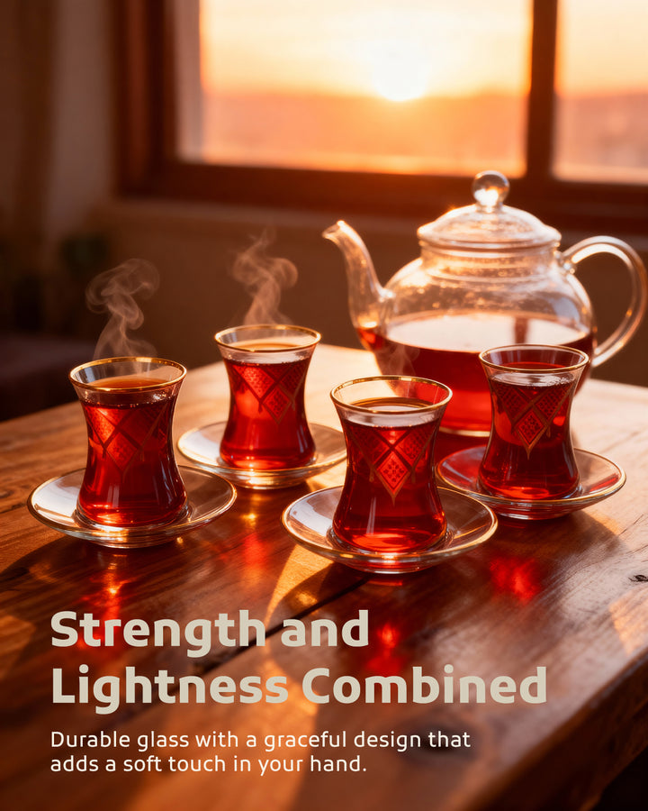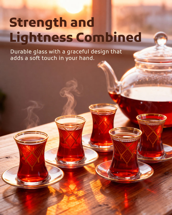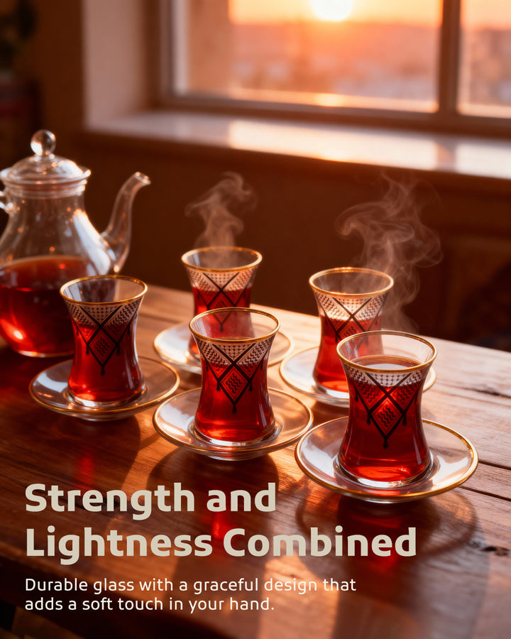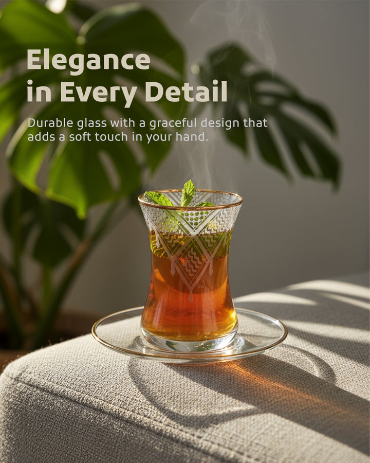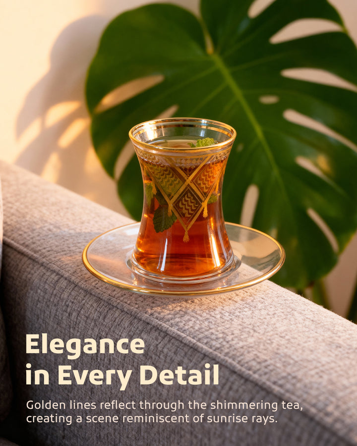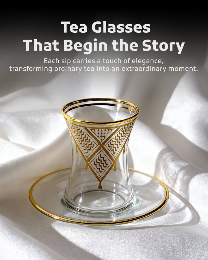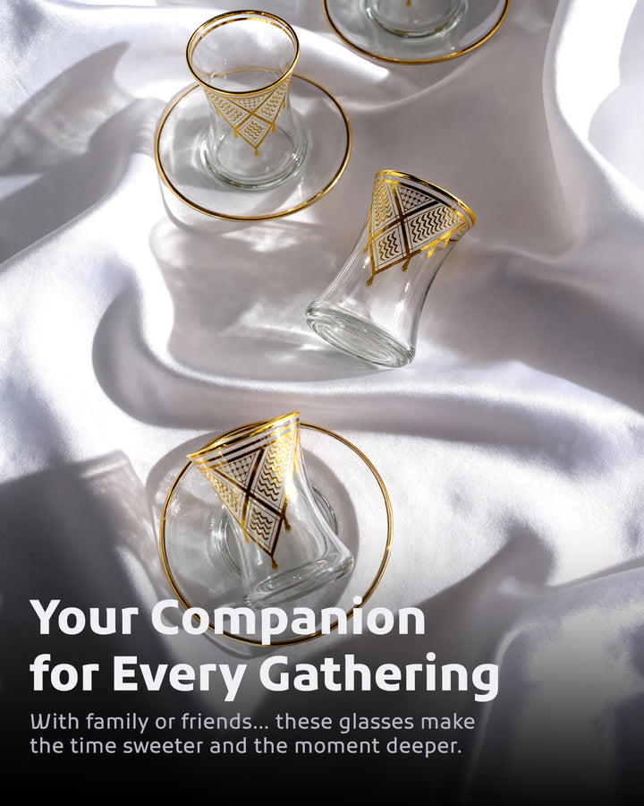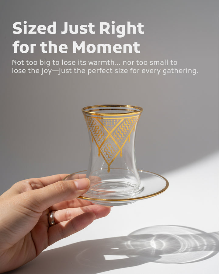 Acquire elegance and heritage with this tea glass set, designed to add a touch of authentic beauty to your tea-drinking experience. Each glass is adorned with intricate Palestinian Keffiyeh patterns, blending luxury with authenticity. The set comprises 6 elegant tea glasses and 6 matching saucers, all embellished with enhancing rims. Available in luxurious colors: radiant golden, a distinctive golden and black combination, or elegant silver to suit various tastes and decors. Perfect for daily use or for serving guests with unmatched style. Important Note: To preserve the quality of the patterns and colors, please hand wash the set and do not place it in the dishwasher.