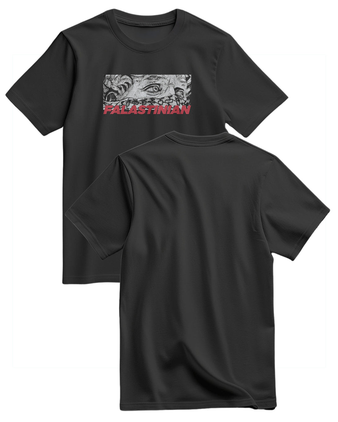 A Regular, Relaxed-Fit T-Shirt With A Large, Central Print On The Chest. The Print Is A Black-And-White Artistic Drawing Depicting A Fragment Of Contemporary Sculpture, Specifically The Eyes And Forehead, Which Appear To Be Enclosed In Chains. Below The Drawing Is The Word "falastinian" In A Large, Red Print, Adding A Powerful And Defiant Air To The Design. Fabric: 100% Cotton