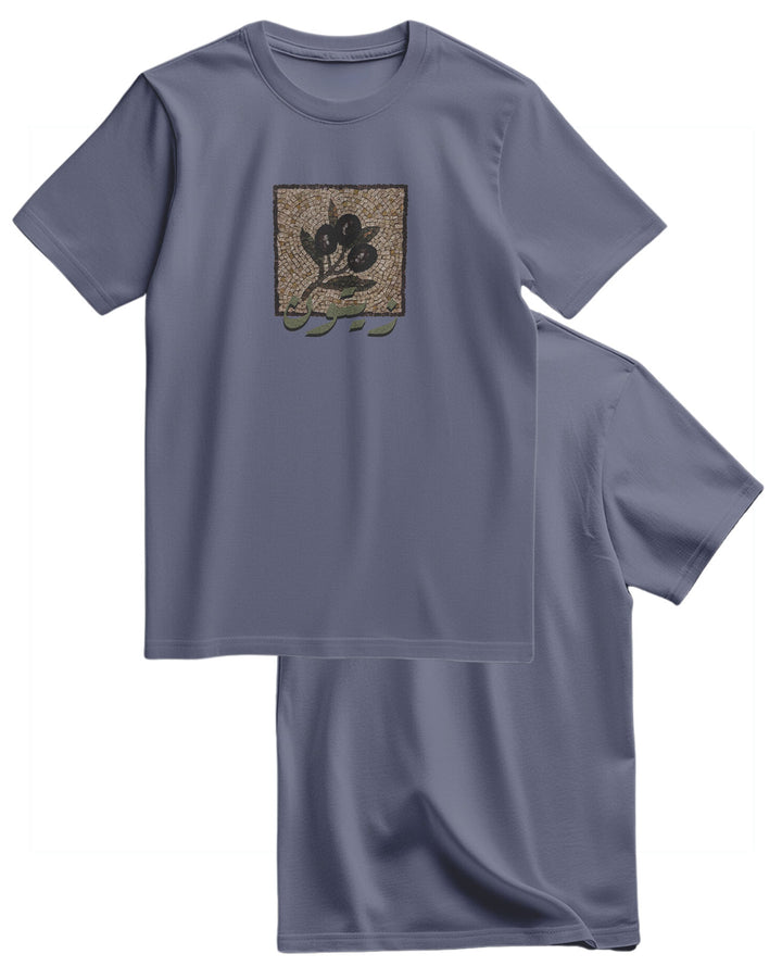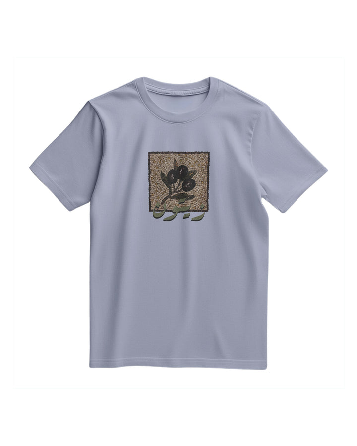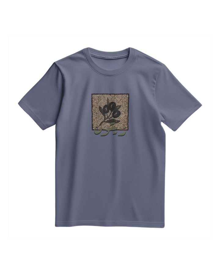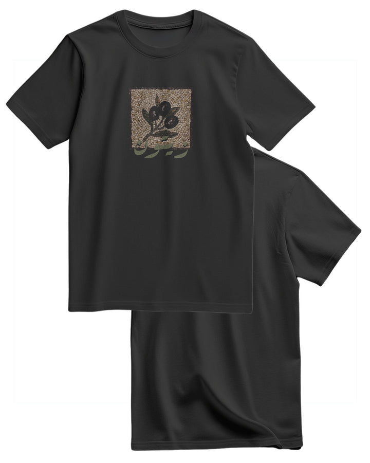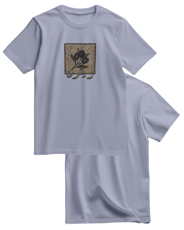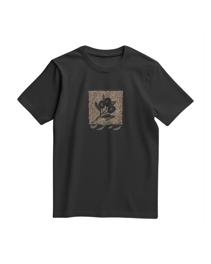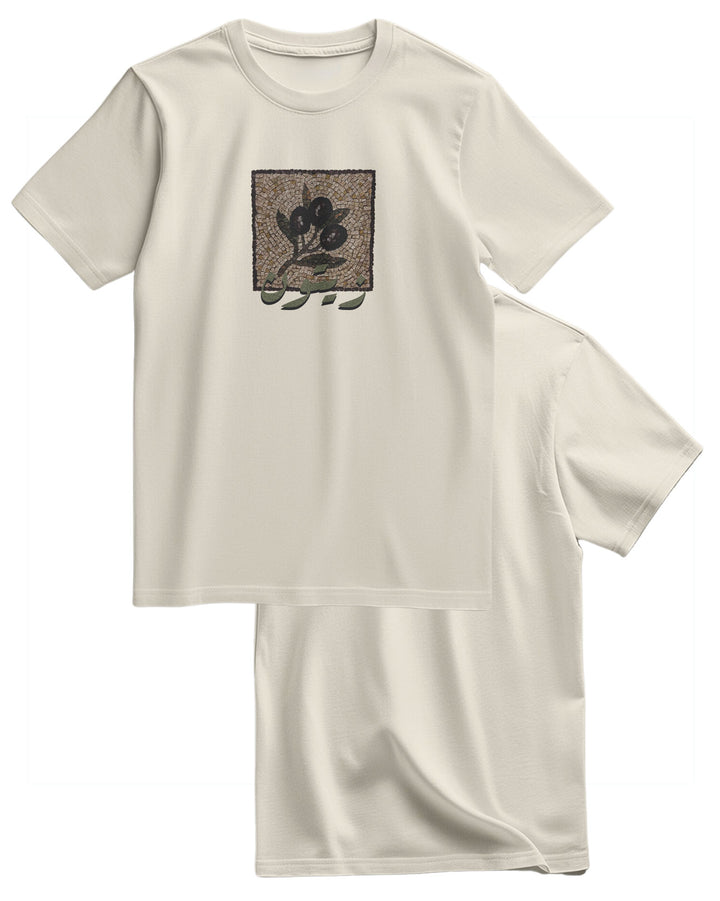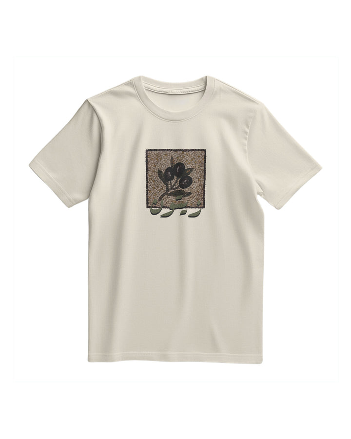 A Regular, Relaxed-Fit T-Shirt Made From 100% Natural Cotton. It Features A Square, Artistic Print At The Center Of The Chest. The Print Is Inspired By Mosaic Art, Depicting An Olive Branch And Its Fruits In Earthy Tones And Muted Colors. Below The Branch, The Word "palestine" Is Written In Elegant Arabic Script, Adding An Authentic Heritage Touch To The Design. Fabric: 100% Cotton