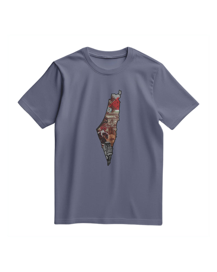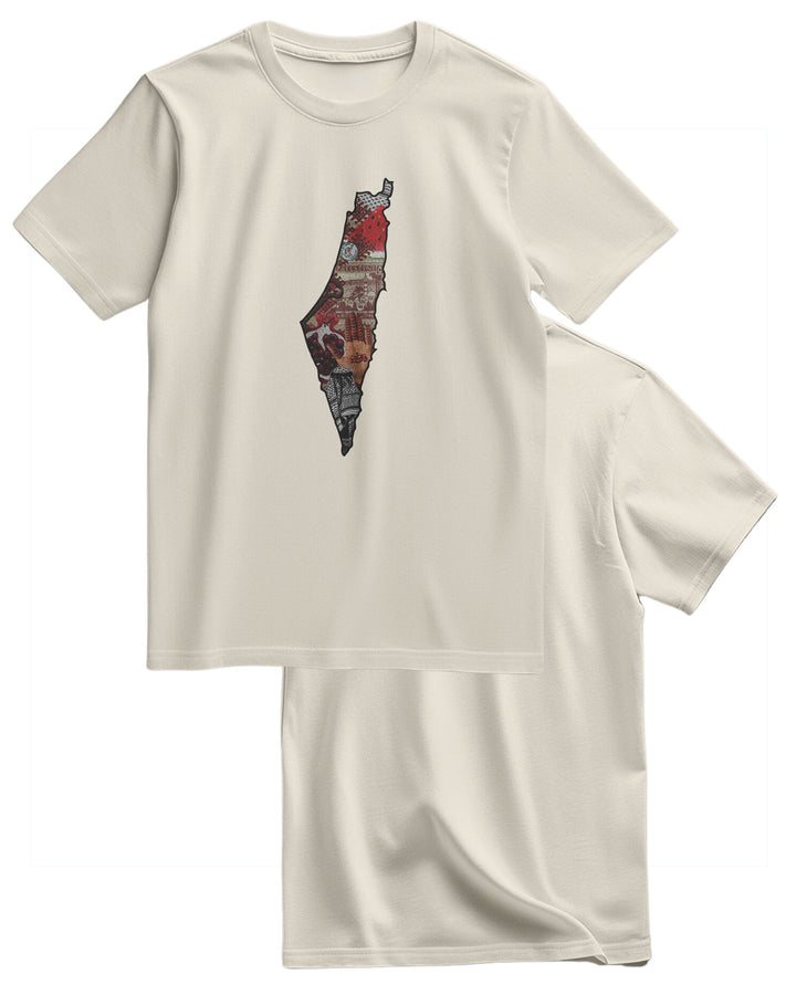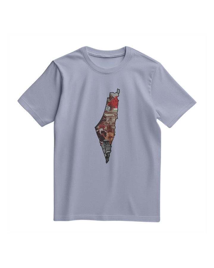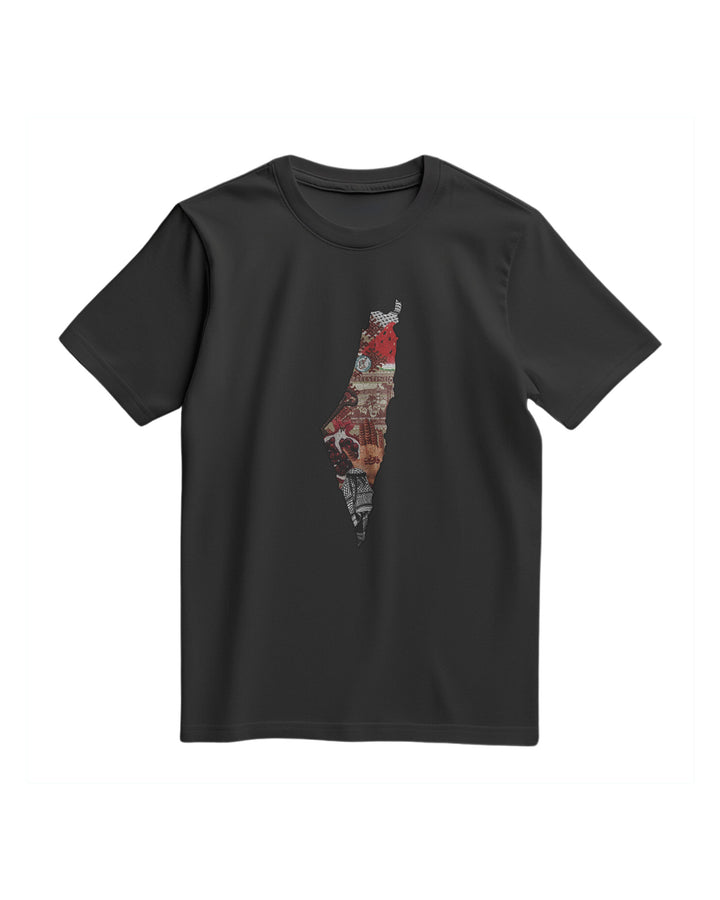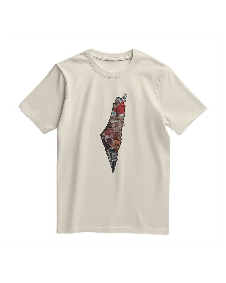 A Regular, Relaxed-Fit T-Shirt Made Of 100% Cotton. A Large, Artistic Print Of A Map Of Palestine Is Featured At The Center Of The Chest. The Map Is Not A Single Color, But Rather A Detailed Collage Pattern That Incorporates Various Palestinian Cultural And Historical Elements, Such As Traditional Motifs And Architectural Symbols. This Unique Design Combines The Symbolism Of The Land With The Beauty Of Its Heritage, Creating An Artistic Piece That Expresses Identity And Belonging.