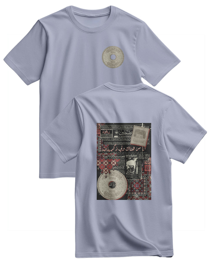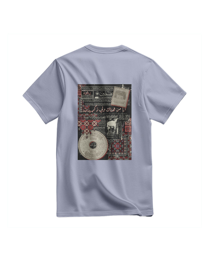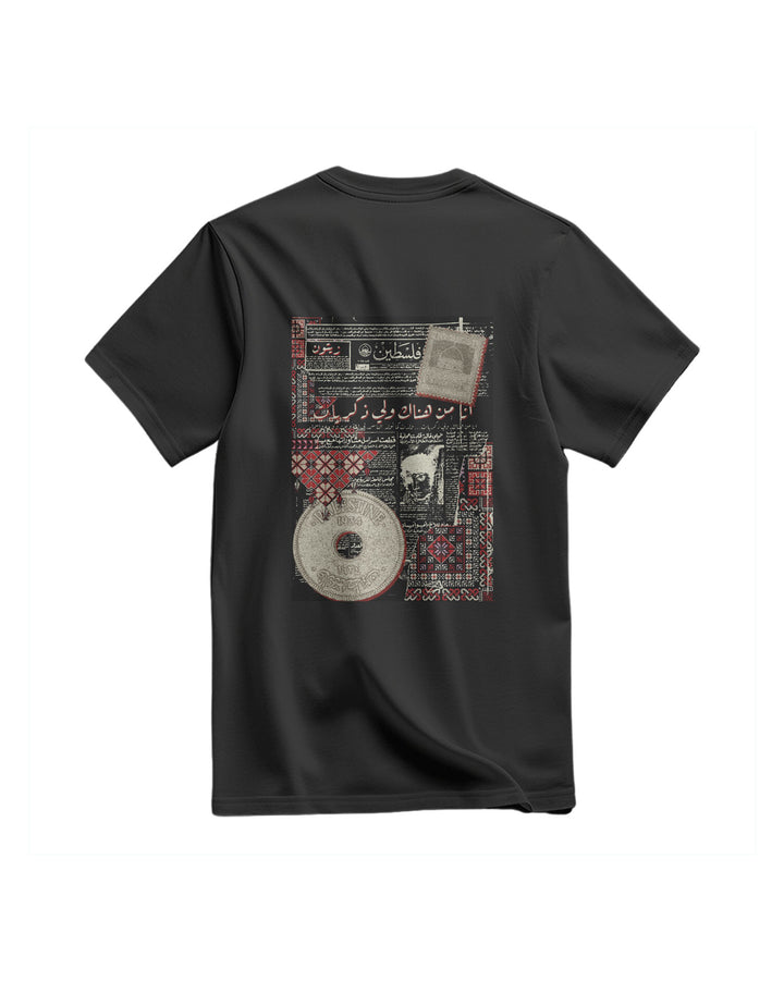 A Regular, Relaxed-Fit T-Shirt. It Features A Large, Unique Print On The Chest. The Design Is Inspired By An Old Palestinian Newspaper Page Featuring Arabic Text And Headlines, Giving It A Unique Heritage And Historical Atmosphere. The Design Combines The Simplicity Of The T-Shirt With The Depth Of History, Creating A Meaningful Piece That Expresses Identity And Heritage. Fabric: 100% Cotton