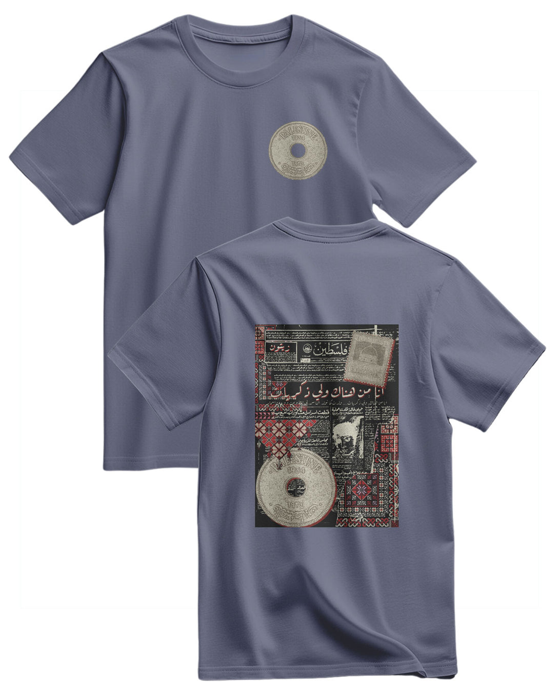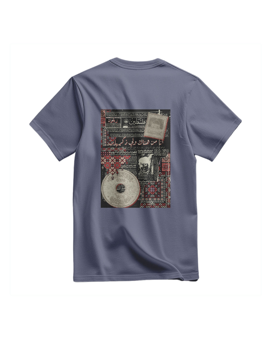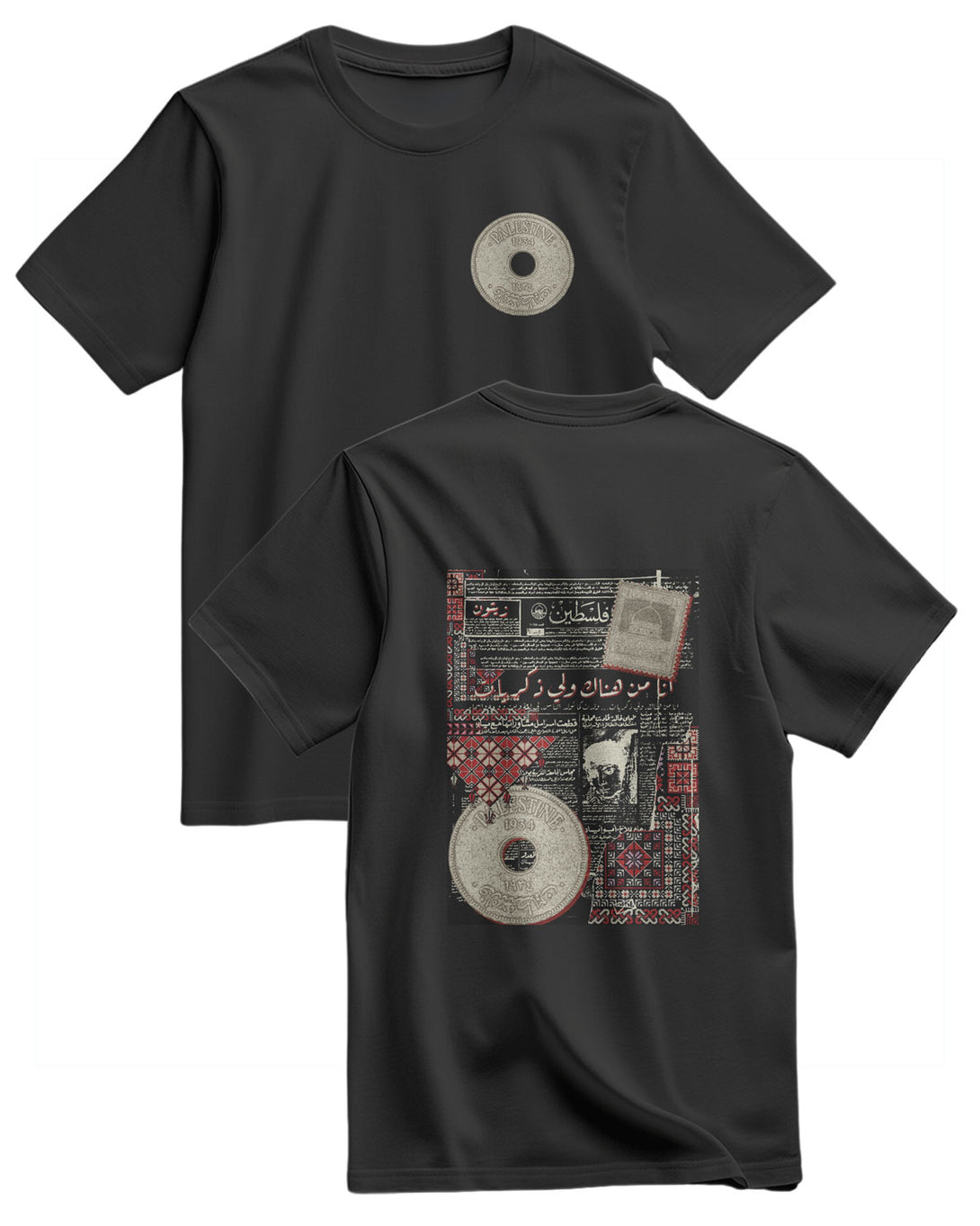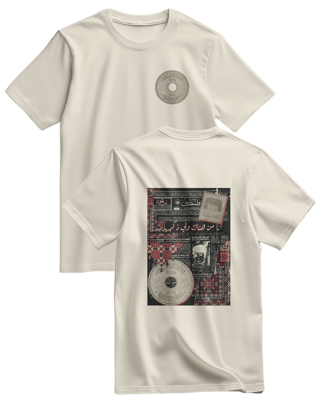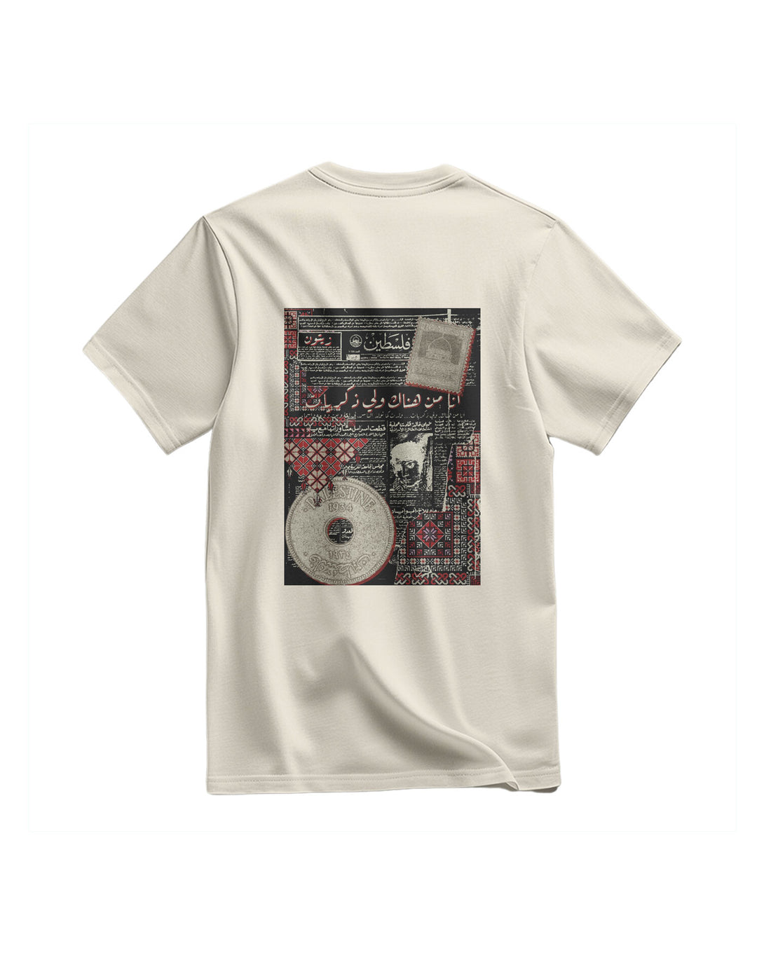 A Regular, Relaxed-Fit T-Shirt. It Features A Large, Unique Print On The Chest. The Design Is Inspired By An Old Palestinian Newspaper Page Featuring Arabic Text And Headlines, Giving It A Unique Heritage And Historical Atmosphere. The Design Combines The Simplicity Of The T-Shirt With The Depth Of History, Creating A Meaningful Piece That Expresses Identity And Heritage. Fabric: 100% Cotton