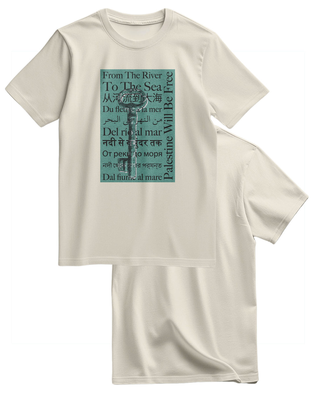 A Regular, Relaxed-Fit T-Shirt With A Striking Rectangular Print On The Chest. The Print Features The Slogan "free Palestine" In Arabic And English, And The Phrase "from The River To The Sea" In Several Languages, Including Chinese, French, Spanish, Russian, Hindi, And Italian. At The Center Of The Design Is An Image Of The Key Of Return, A Key To The Palestinian Cause. This T-Shirt Is A Work Of Art That Expresses Solidarity And Freedom. Fabric: 100% Cotton