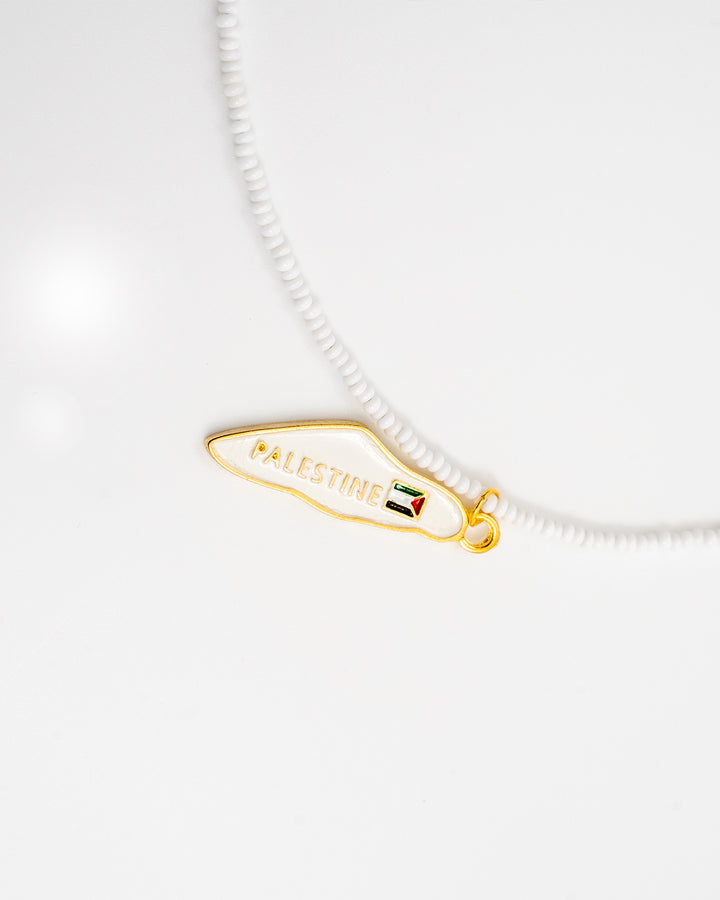 Add a touch of purity and hope to your look with this unique necklace inspired by Palestine's aspirations for peace. The necklace features an elegant chain of pure white beads, symbolizing peace, innocence, and optimism for a bright future. Centered on the necklace is a polished metallic pendant in the shape of the Palestine map, shining in brilliant white and adorned with the vibrant colors of the Palestinian flag, with the word "PALESTINE" engraved on it to reinforce identity. This necklace is more than just an accessory; it is an expression of deep belonging and ancient heritage, and an ideal gift for anyone who carries Palestine in their heart and wishes to carry a part of it with them wherever they go.