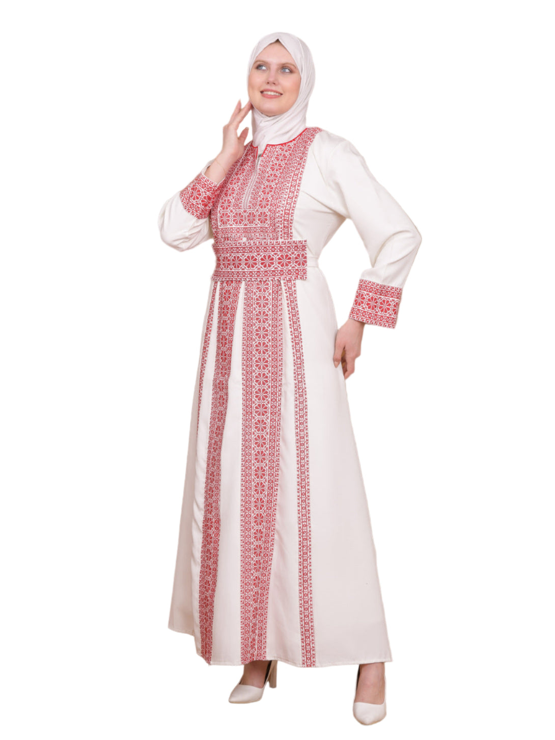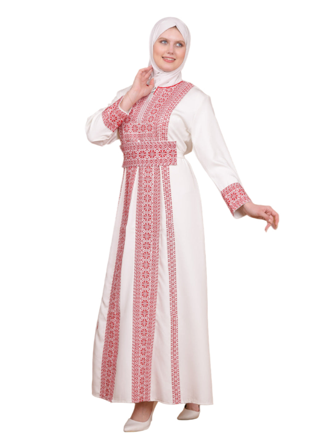 White Color Red Roses Palestinian Traditional Embroidered Dress C100056