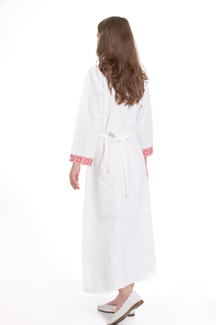 The thobe features a bright white color which provides the perfect base for the traditional embroidery. Dense embroidery in fiery red covers the chest area and the ends of the sleeves, following the geometric patterns known in Palestinian art.