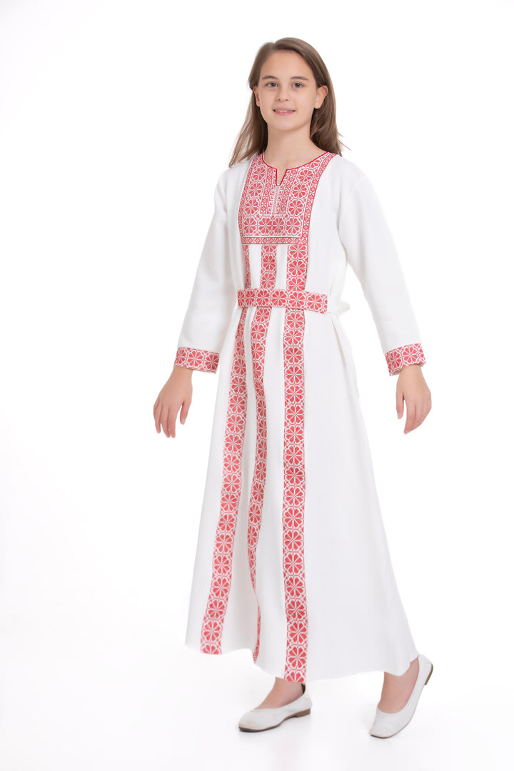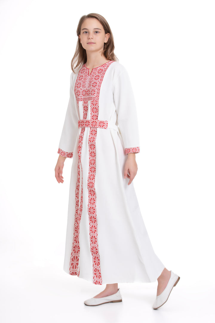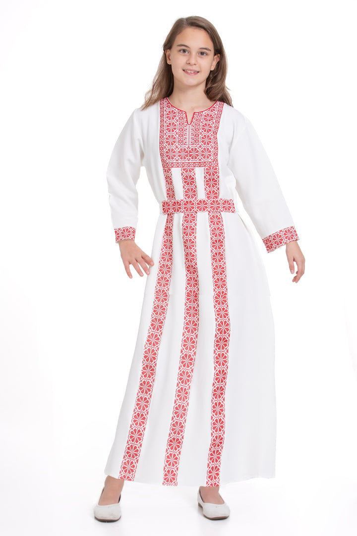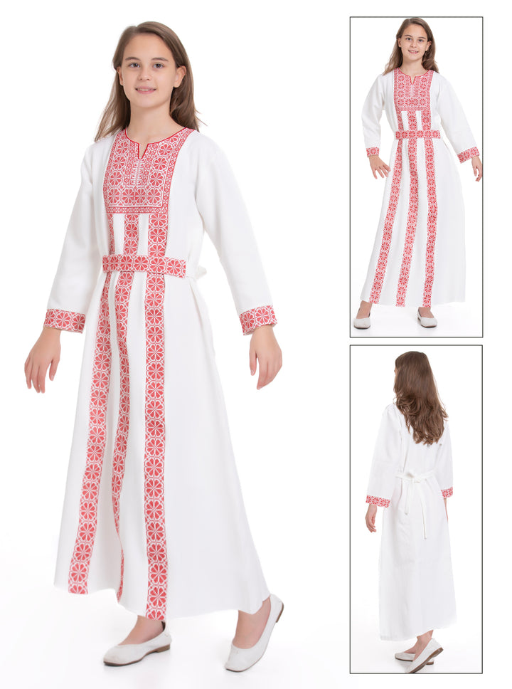 White Palestinian Kids Thobe Embroidered with Red Stripes