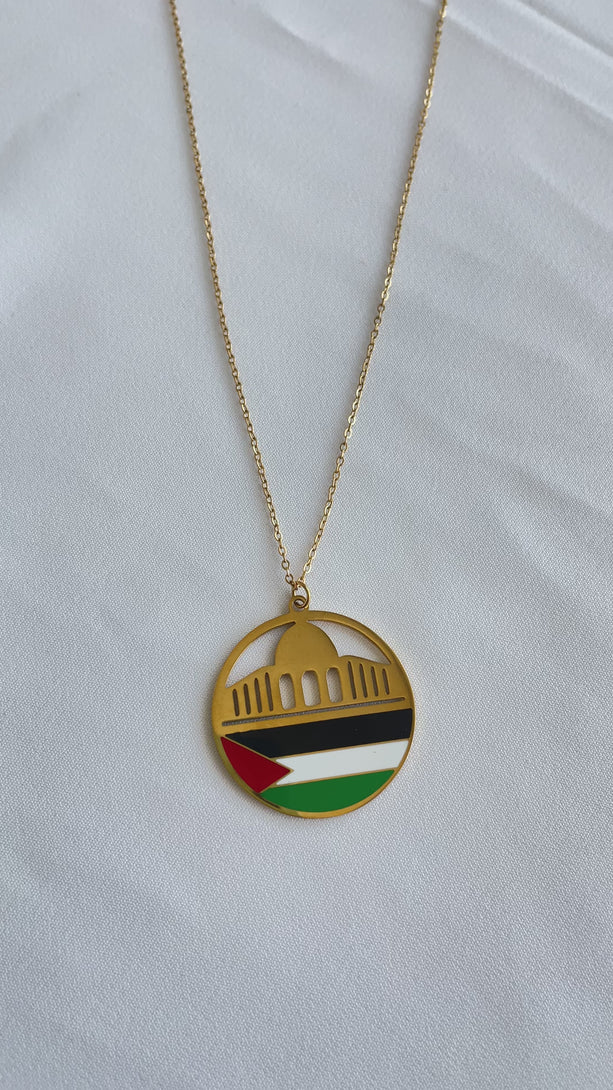 Carry a piece of Al-Quds Al-Sharif, the pulsating heart of Palestine, close to your heart with this luxurious golden necklace. The necklace features a masterfully crafted circular pendant made from gleaming golden metal, encapsulating the majestic golden Dome of the Rock with its captivating architectural details. The beauty of the design is completed by the vibrant colors of the Palestinian flag (red, green, white, black) in the lower part of the circle, giving it a profound national and spiritual character. This necklace is more than just an adornment; it is a symbol of pride, steadfastness, and spiritual connection to one of the holiest places on Earth. Suspended from an elegant golden chain, this necklace is an ideal gift expressing deep love for Palestine, its rich heritage, and its unwavering faith.